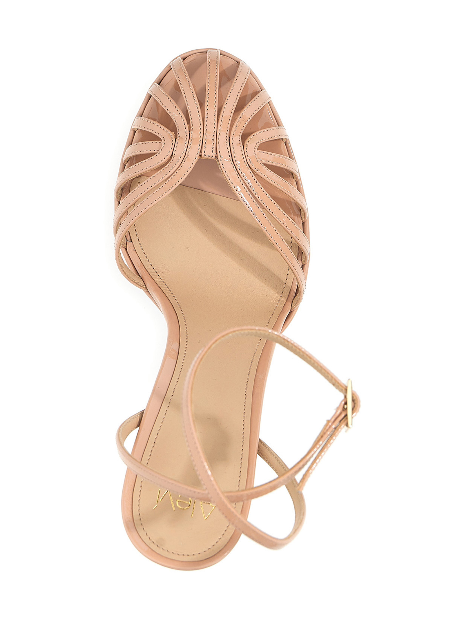 Sandalo ‘Clio’ in pelle verniciata, con cinturino alla caviglia, listini frontali, tacco a spillo e plateau.