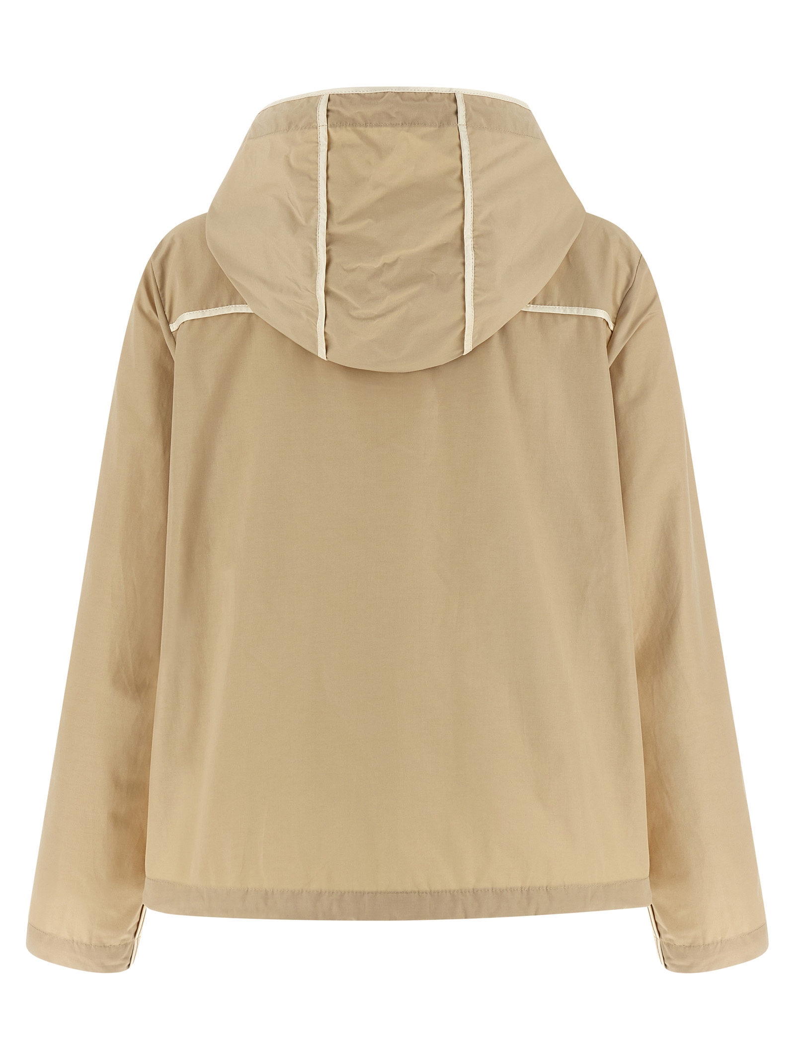 Sarracenia’ hooded jacket in poplin-effect technical fabric, front zip closure, contrast trim, front logo patch, front pockets, adjustable drawstring at the hem, and long sleeves.