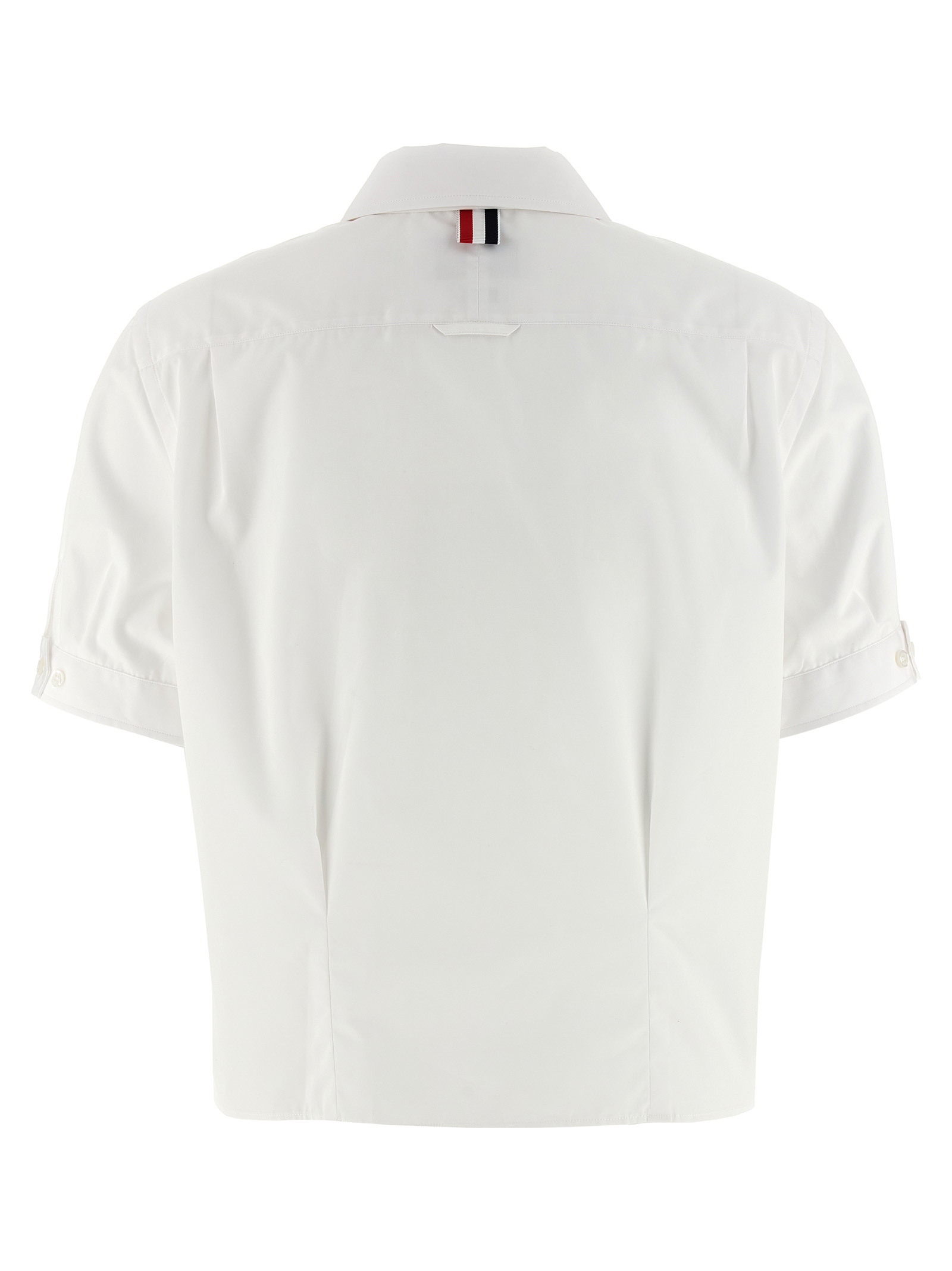 Cotton poplin shirt with removable sash at the neck, front button closure, short cuffed sleeves.