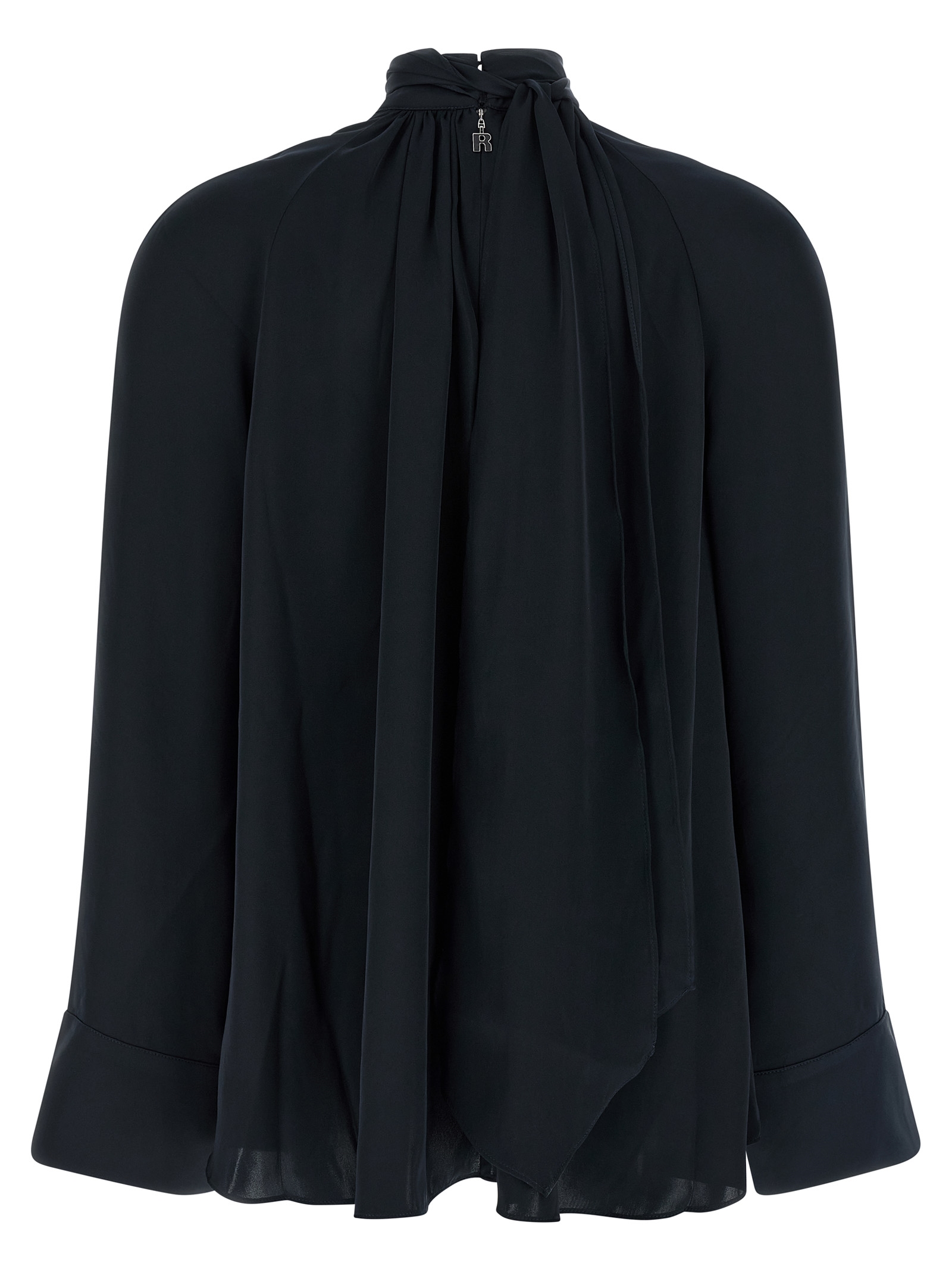 ‘Satin Bow’ blouse in silk-effect fabric with V-neck, sash tied at the neck, back zip closure and logo charm, long sleeves with cuffs.