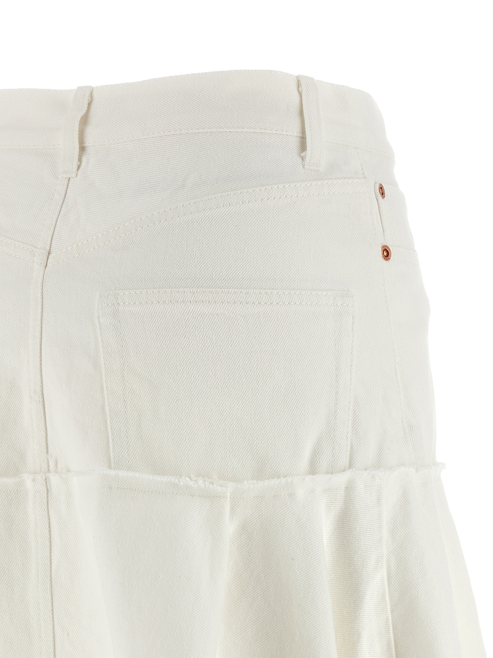 Midi skirt in garment-dyed cotton denim with panel construction, A-line silhouette, front zip and button closure, five pockets, asymmetrical hem with pleated satin-effect fabric insert.