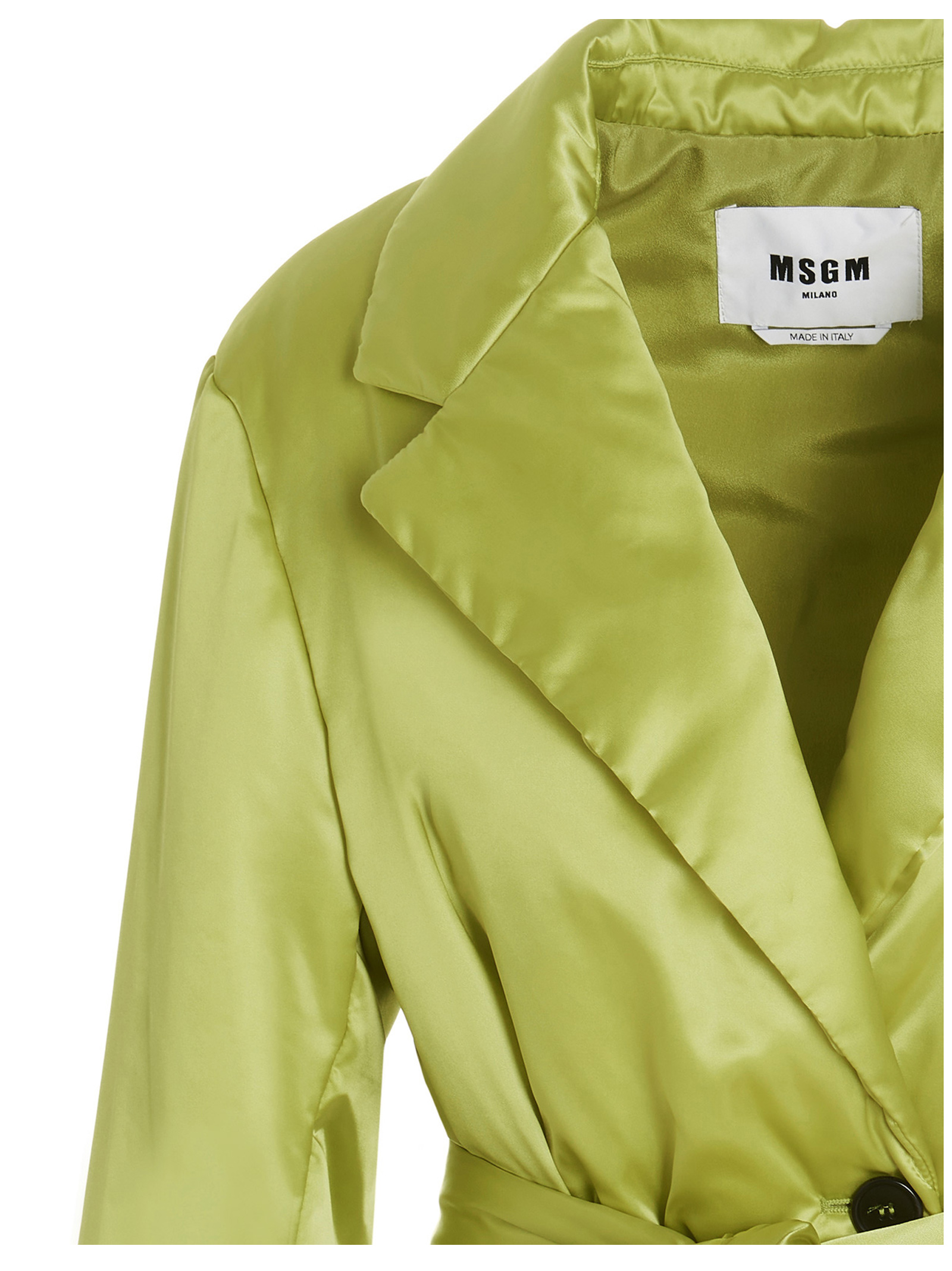 Single breast robe-style puffer jacket with a belt at the waist, contrasting pockets and a single breast closure.