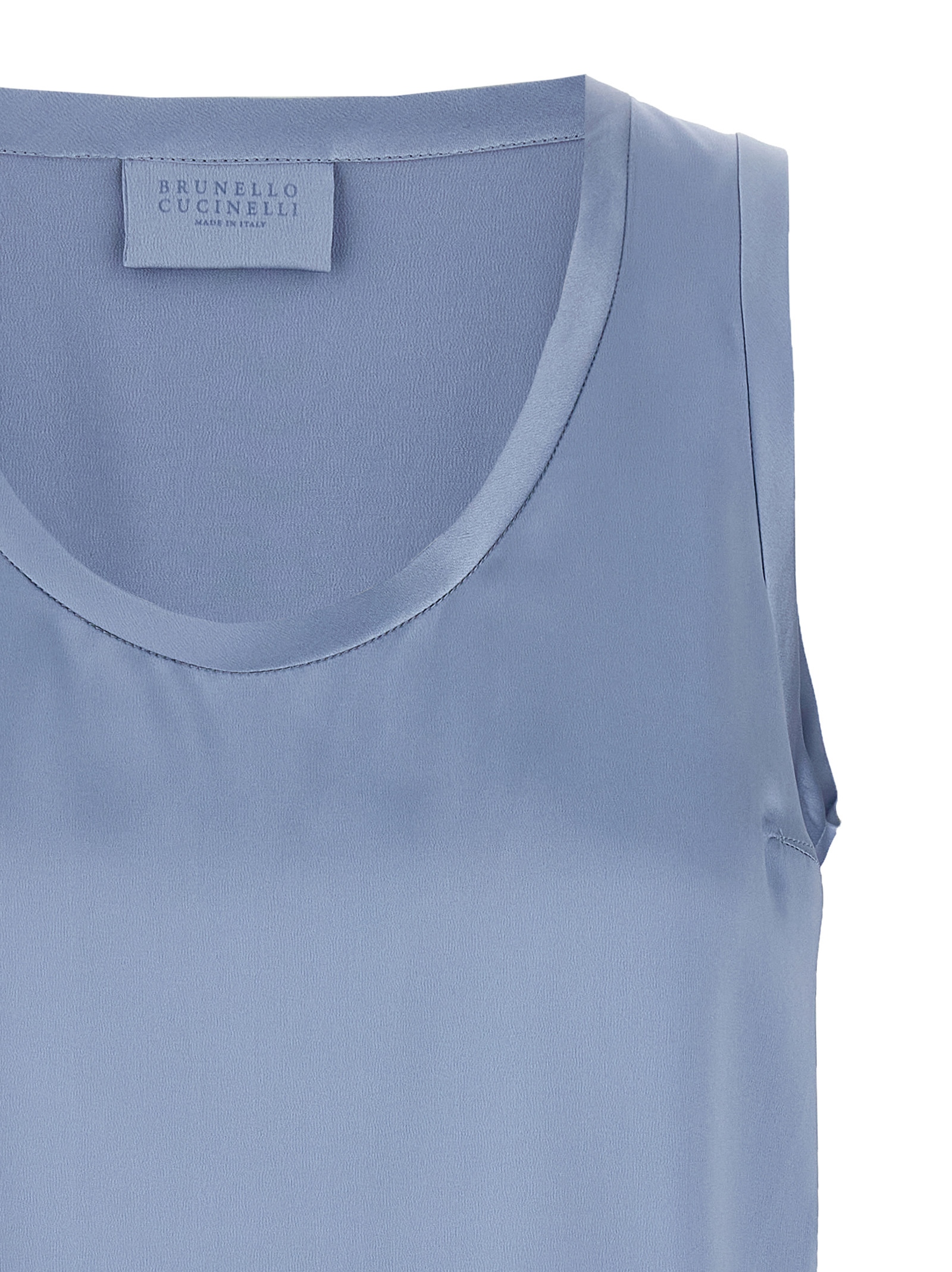 Stretch silk satin top with wide round neckline at the front.
