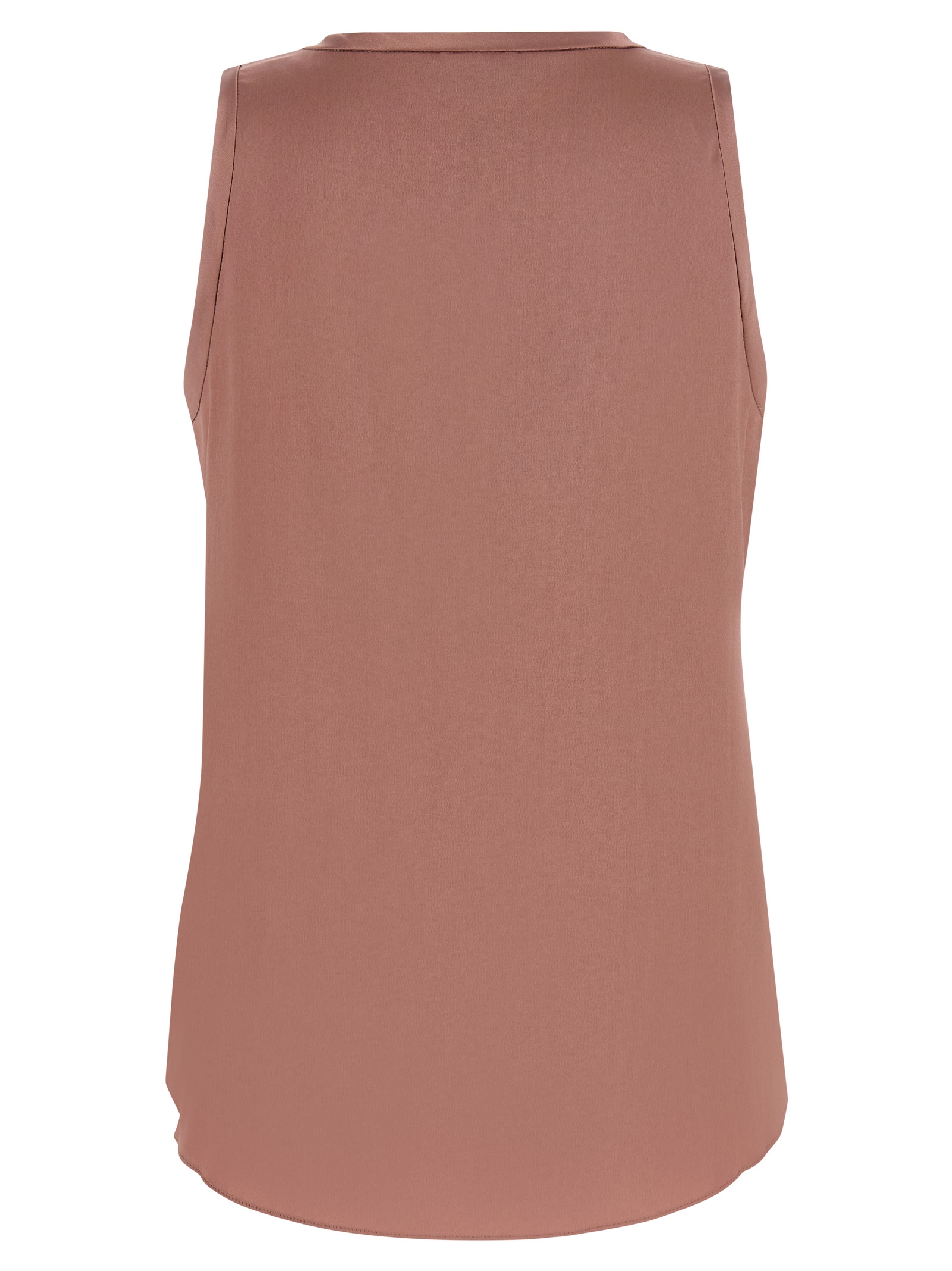 Stretch silk satin top with flared silhouette, wide round neckline at the front.