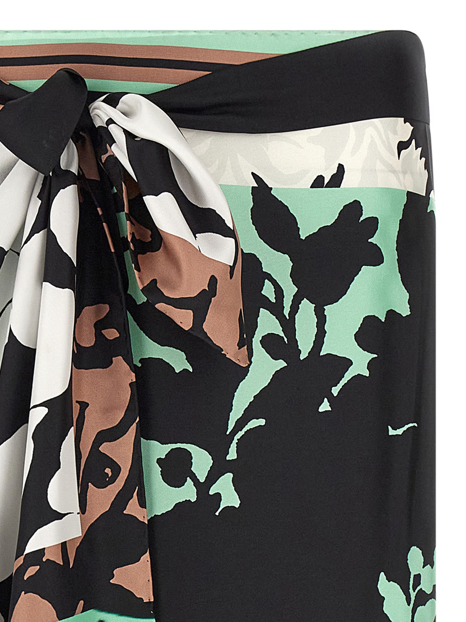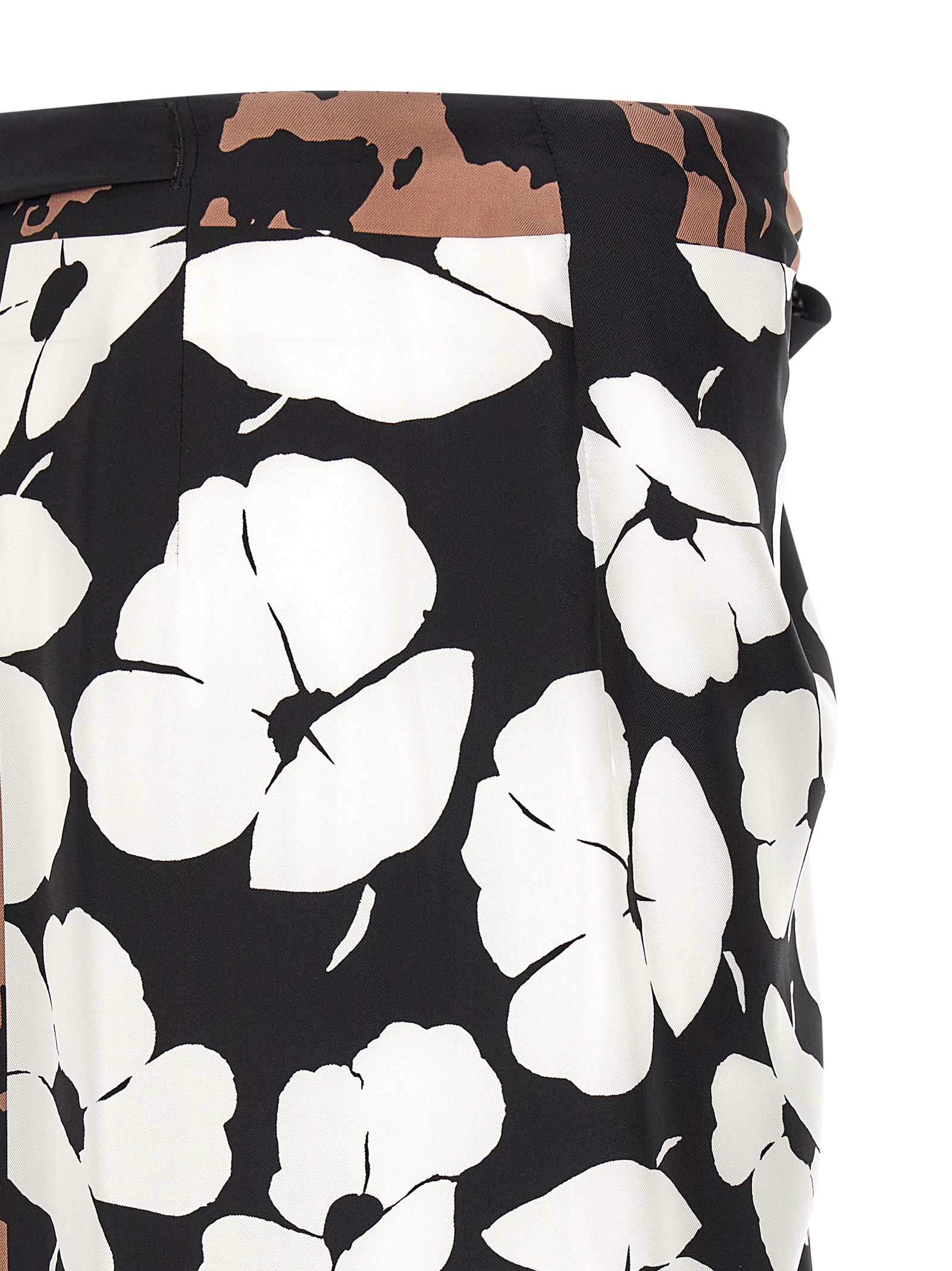 ‘Scarfys Long’ patterned silk midi skirt with wallet style and side ribbon closure.