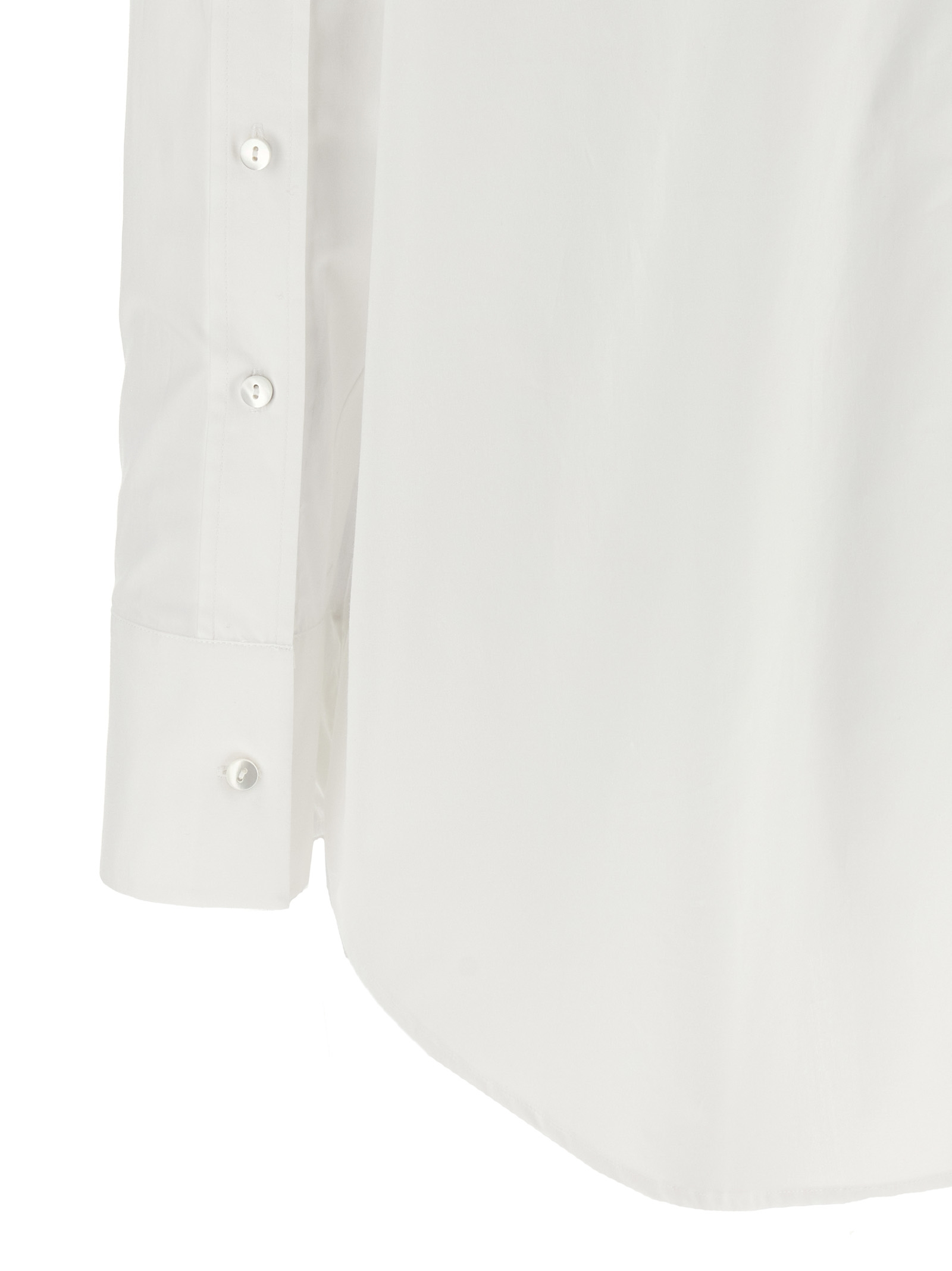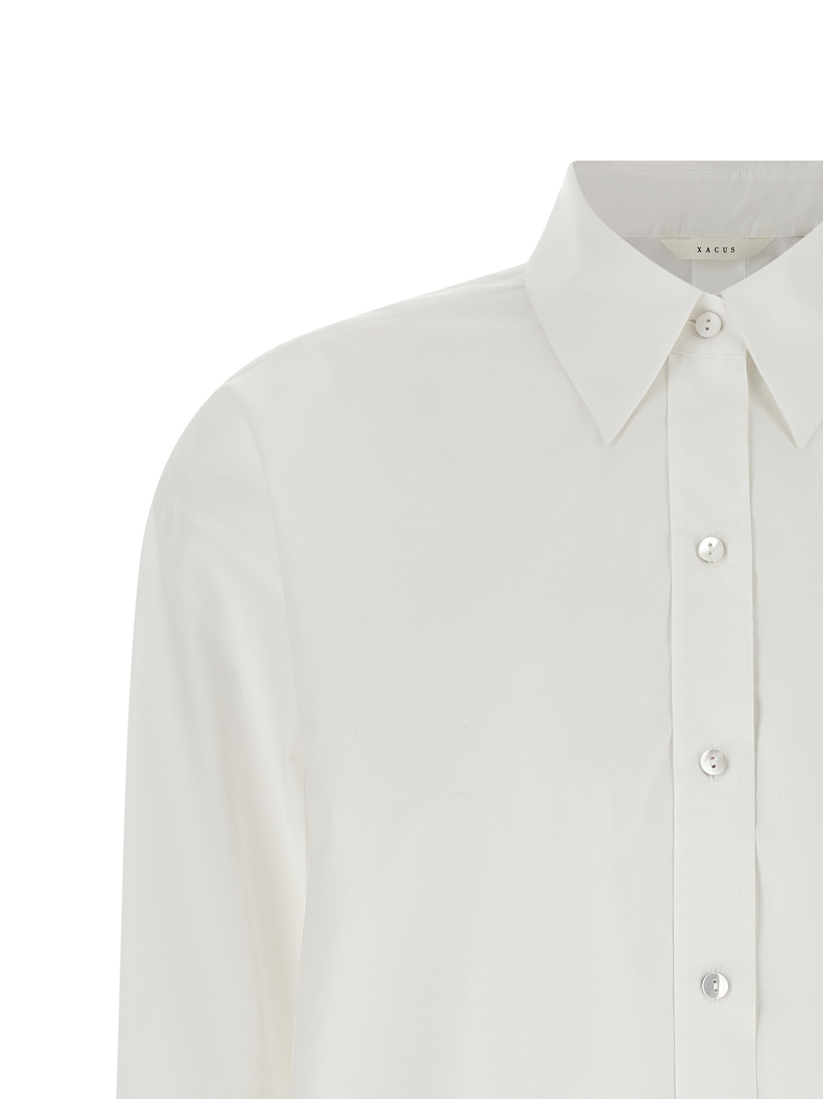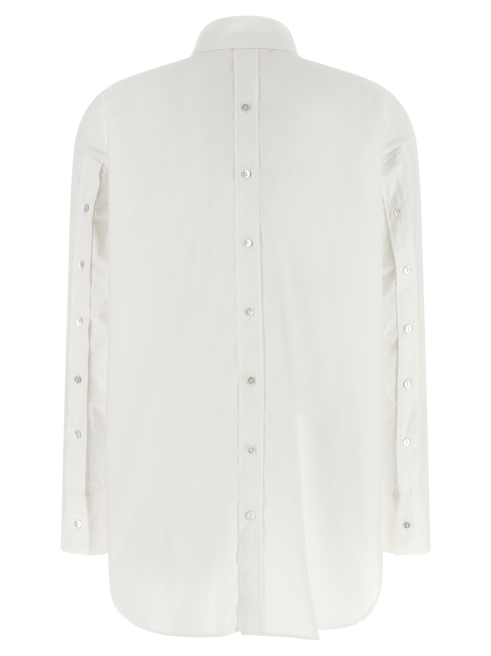 ‘Scarlet’ cotton poplin shirt with mother-of-pearl button closure at the back and on the sleeves, pointed collar, long sleeves with cuffs and dropped shoulders, rounded hem.