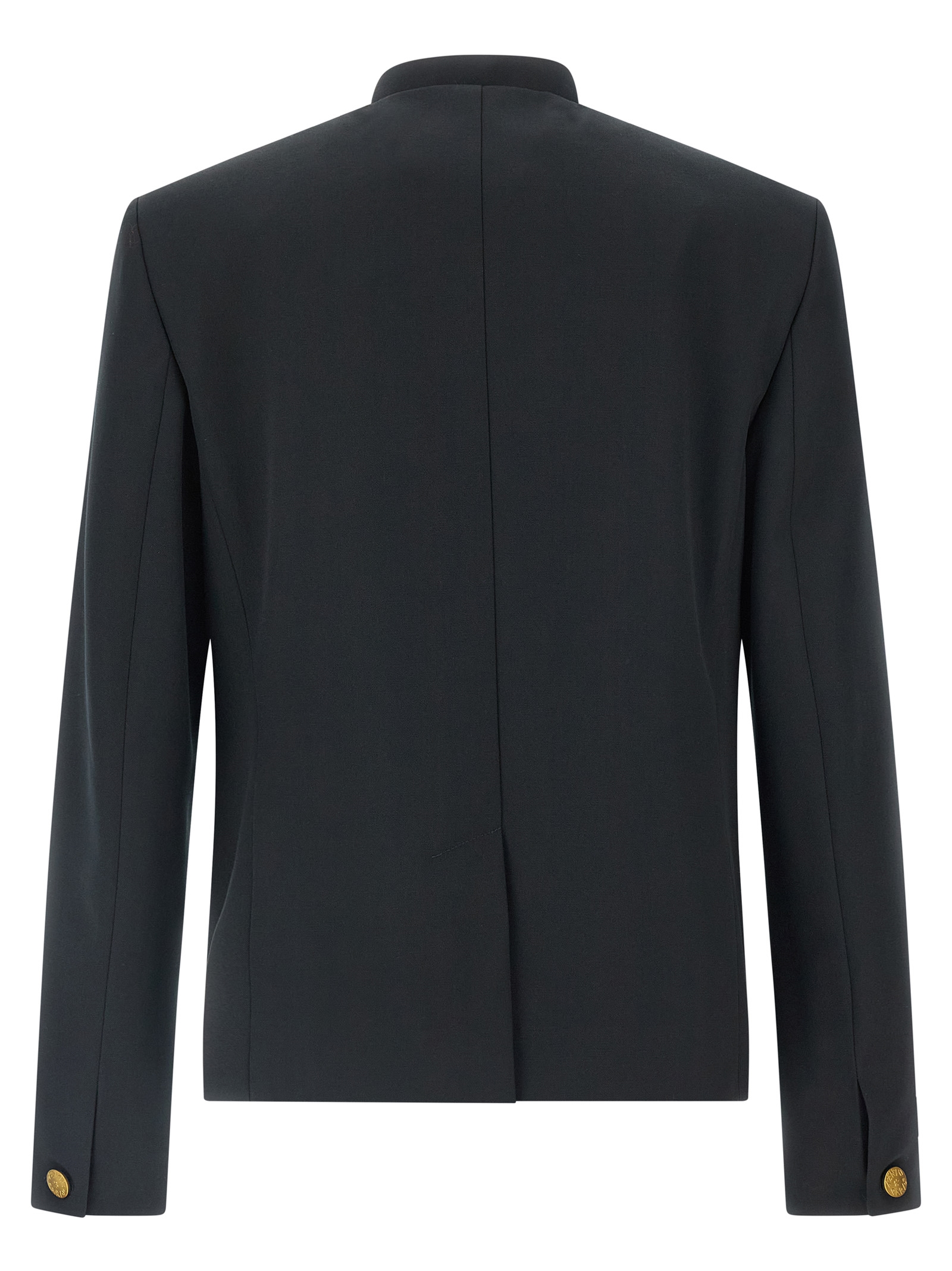School Boy wool jacket with mandarin collar, front closure with metal buttons, front pockets, long sleeves with buttons.