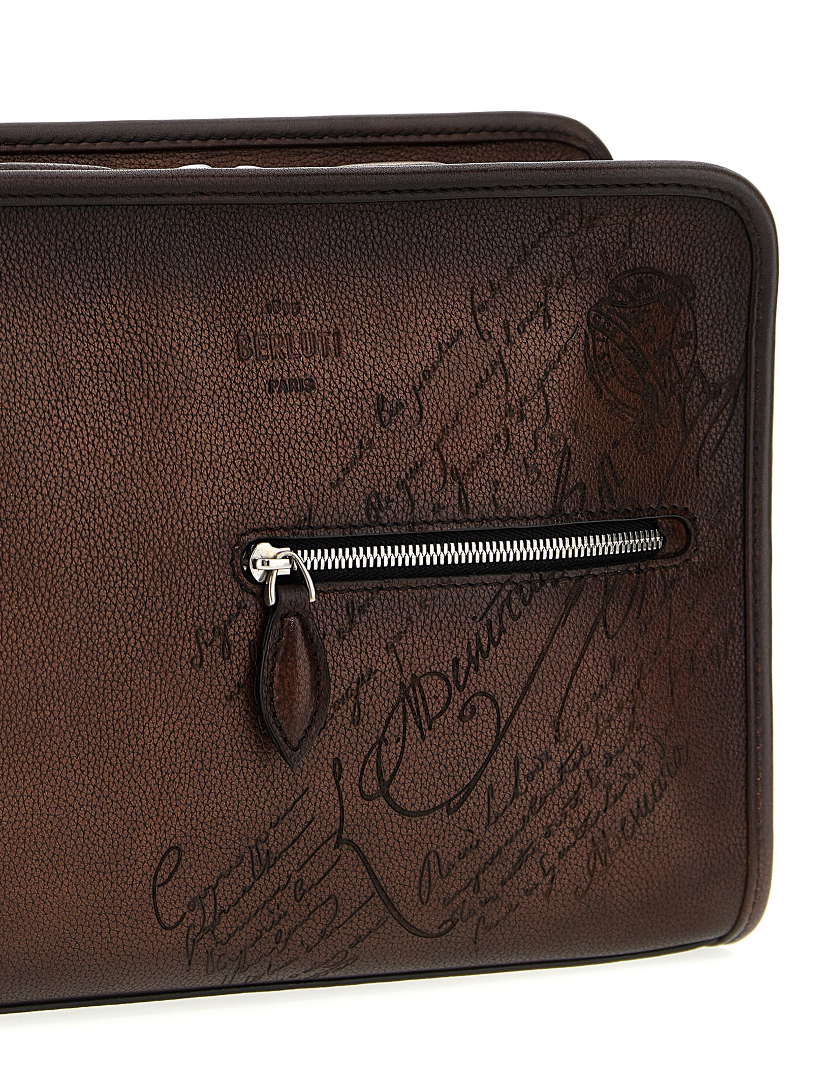 Leather crossbody bag with engraved ‘Scritto’ pattern, zip closure, adjustable shoulder strap.