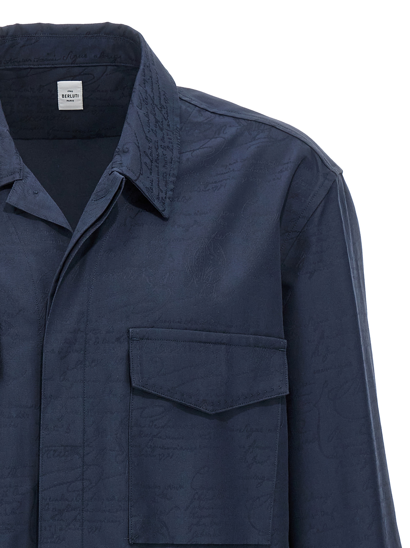 Cotton overshirt with all-over ‘Scritto’ pattern, button closure, pockets, long cuffed sleeves.