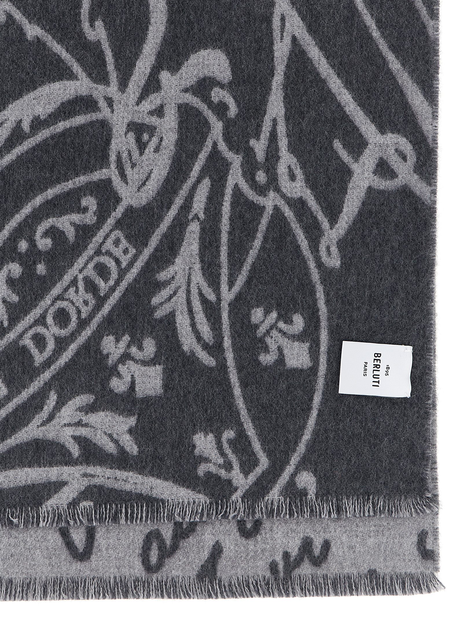 ‘Scritto’ wool jacquard scarf, fringed on the hem.
