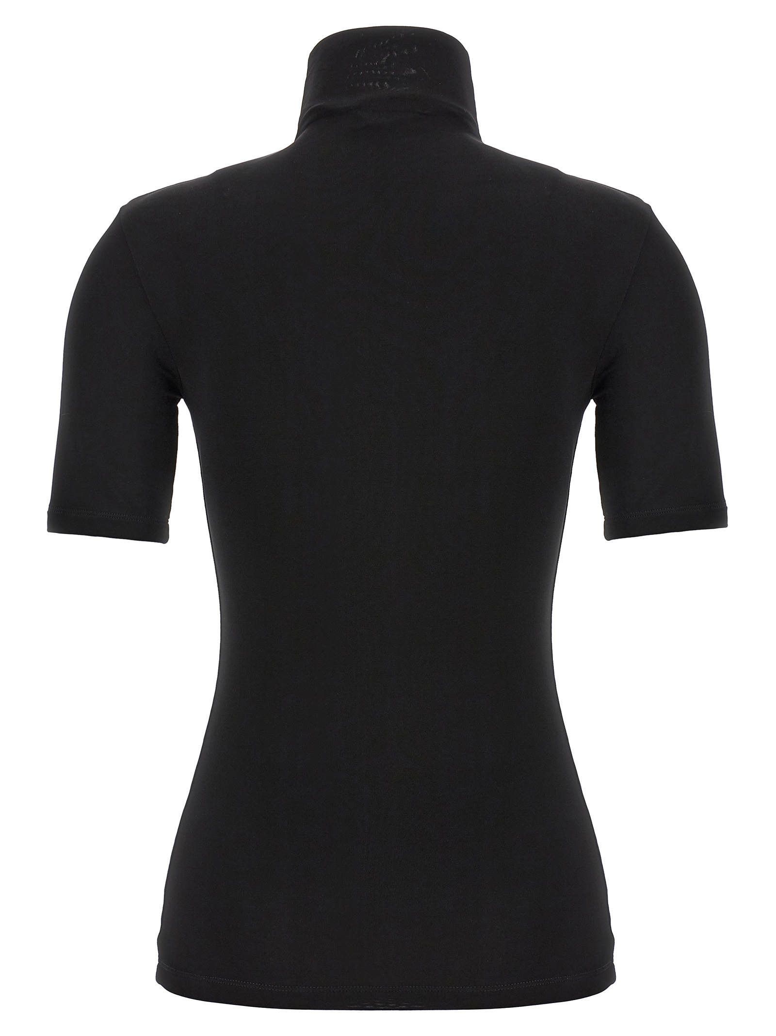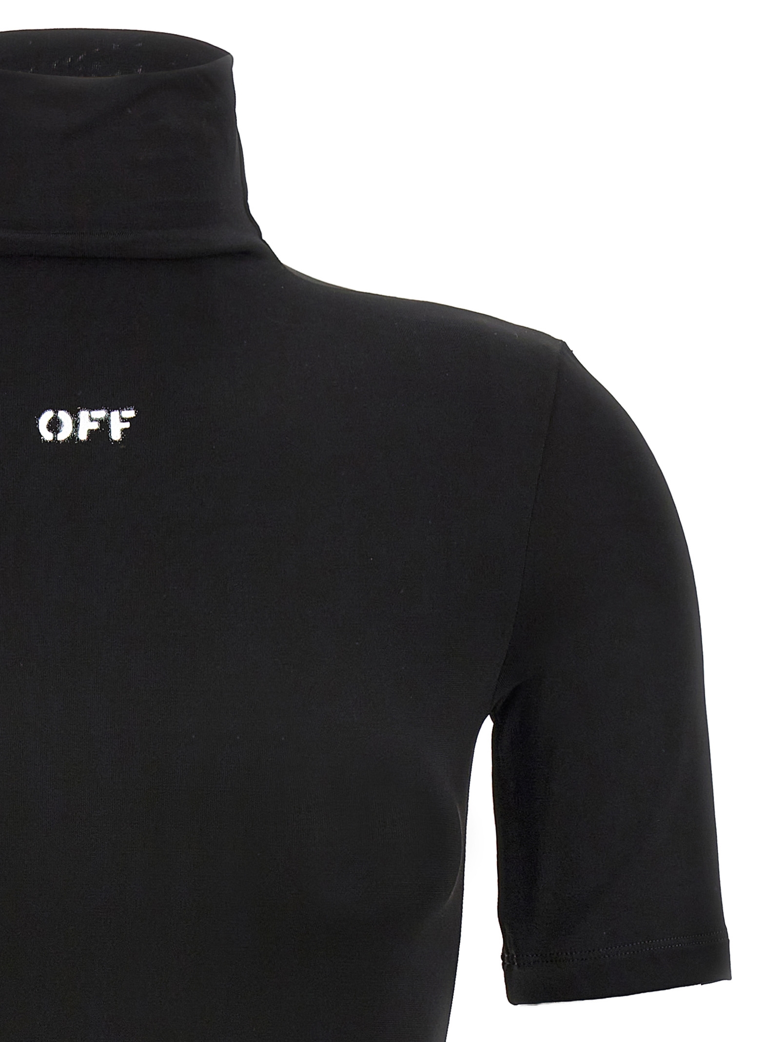 ‘Second skin’ lightweight viscose sweater with high neck, short sleeves, front logo print.