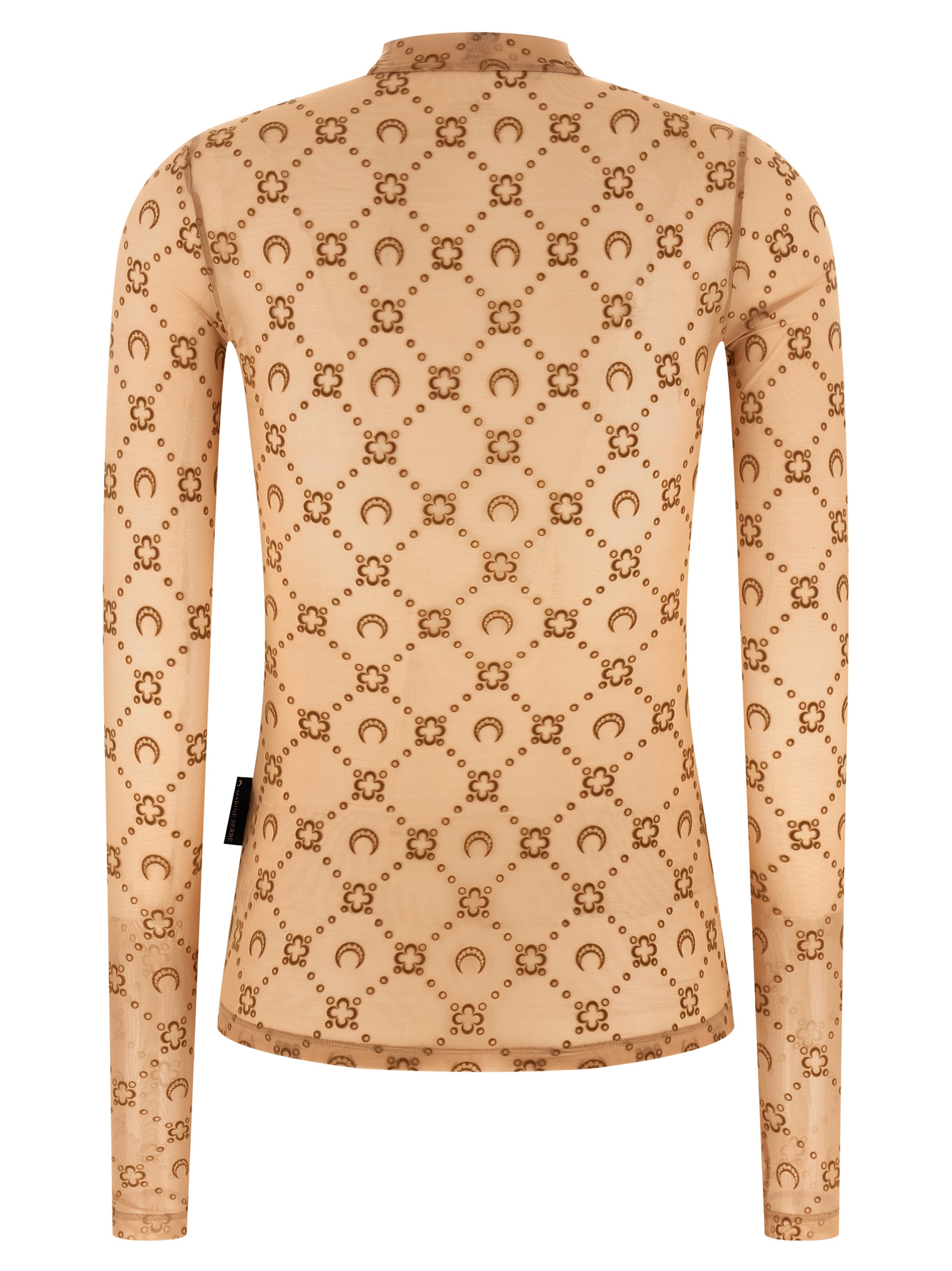 ‘Second Skin’ semi-transparent mesh jersey top with all-over tone-on-tone flocked ‘The Moonogram’ pattern, high neck, long sleeves.