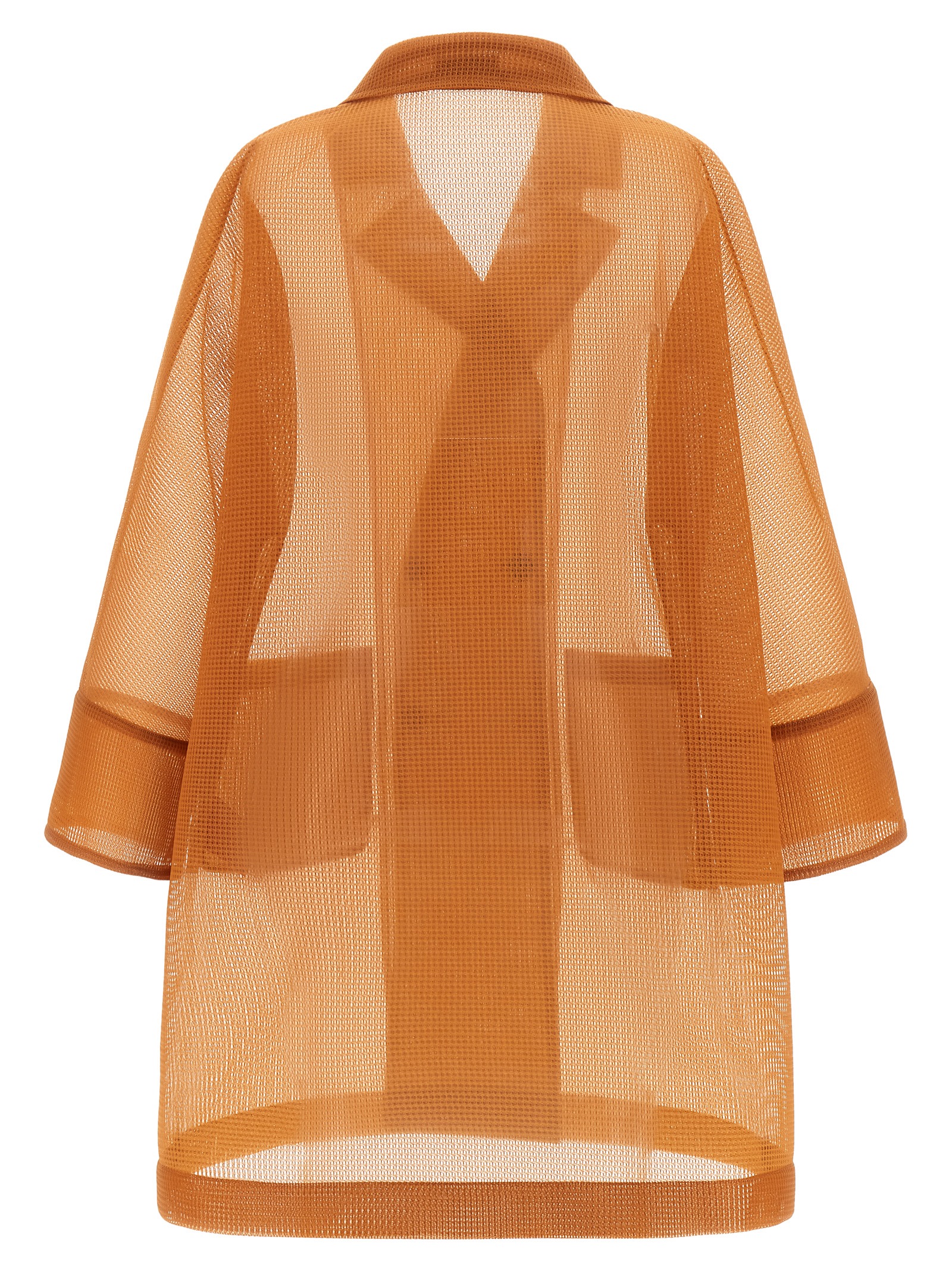 Double-breasted coat made of 20 denier polyester double polyester fabric with See-Through effect mesh structure with front horn button closure, lapel collar, pockets, 3/4 sleeves with cuffs, and unlined.
