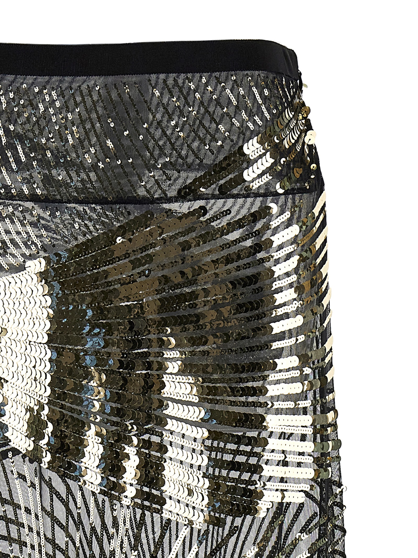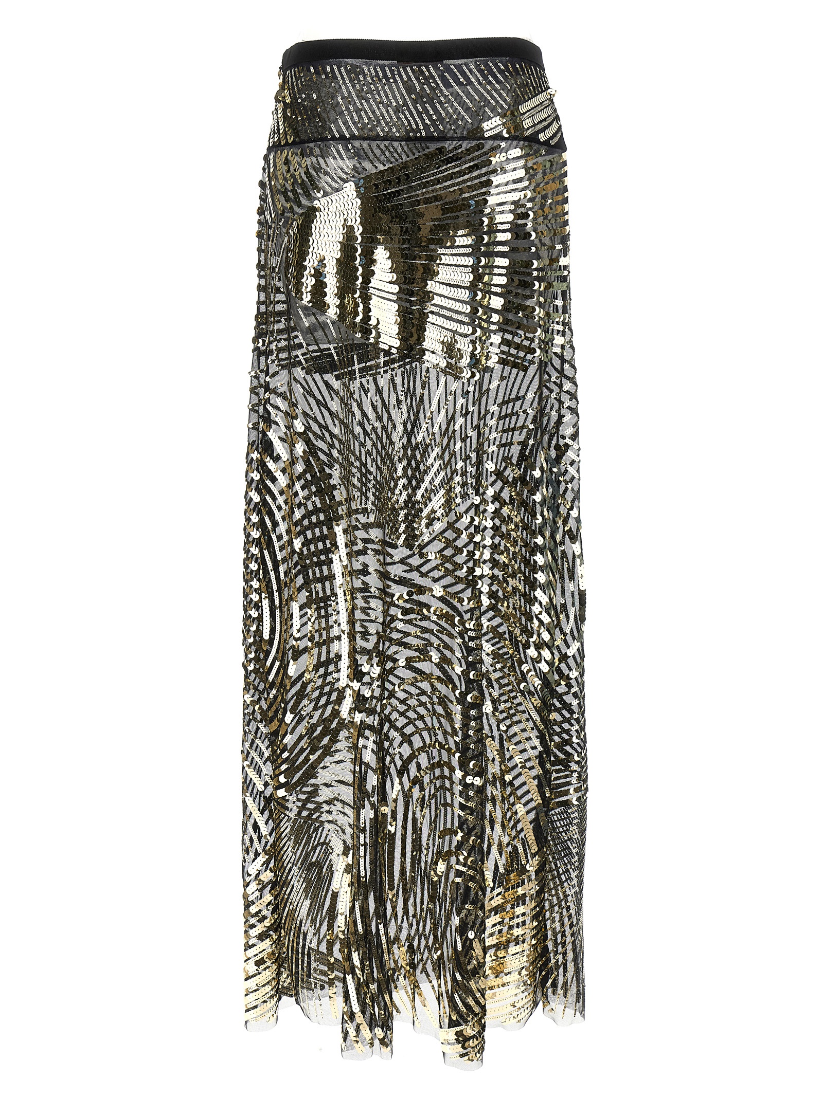 Semi-transparent maxi intulle skirt with ‘Iride’ patterned sequins, grosgrain waist belt, side zip and hook closure.