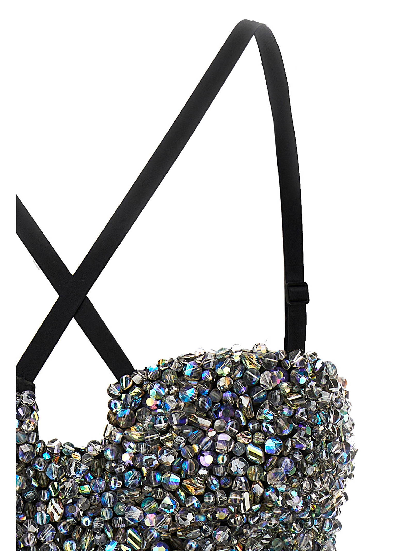 Bustier top with embroidered sequins, thin adjustable shoulder straps that cross at the back, a hook closure.