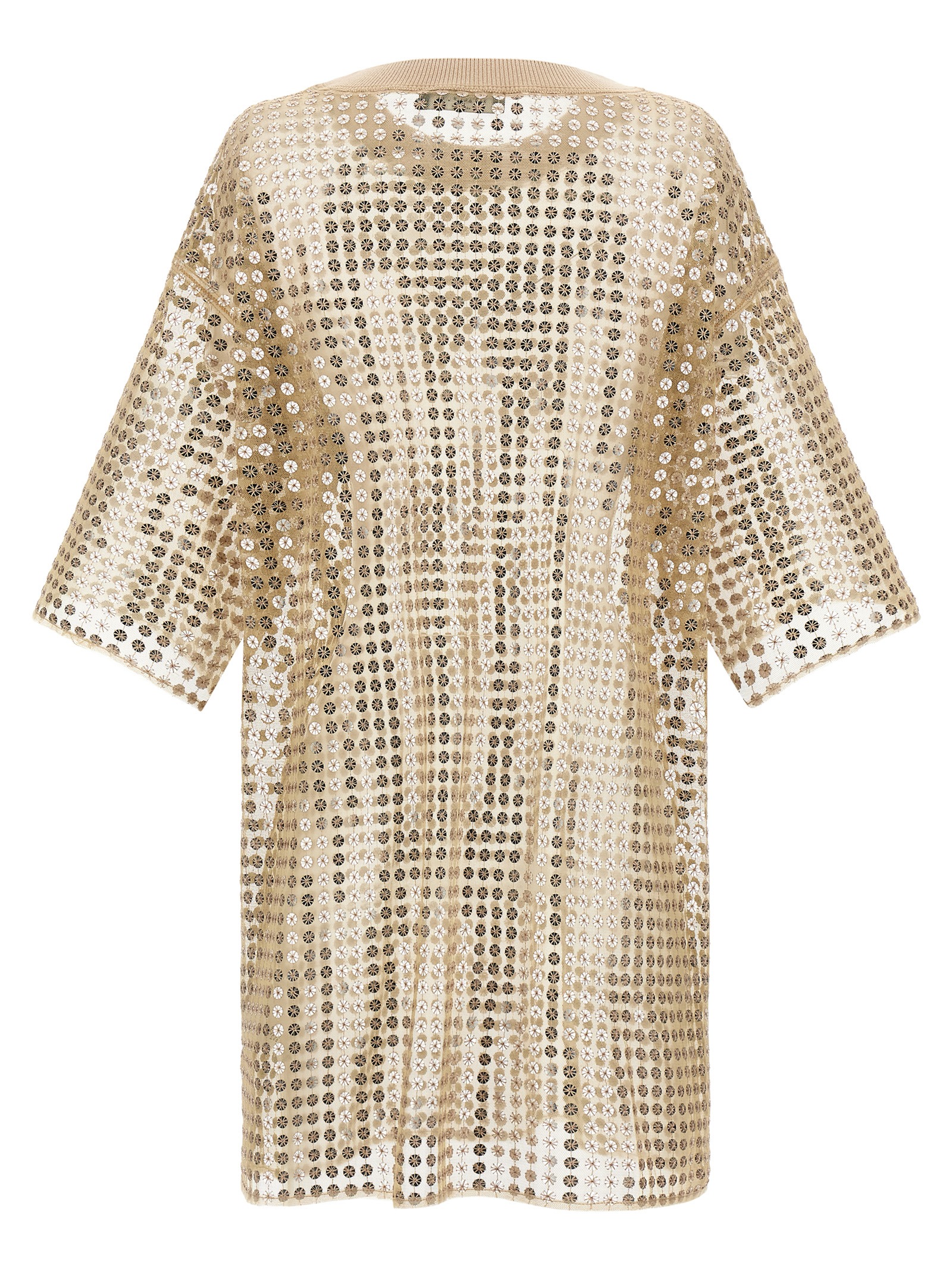Mini dress in semi-transparent mesh with all.over tone-on-tone sequin application, crew neck, and short sleeves.