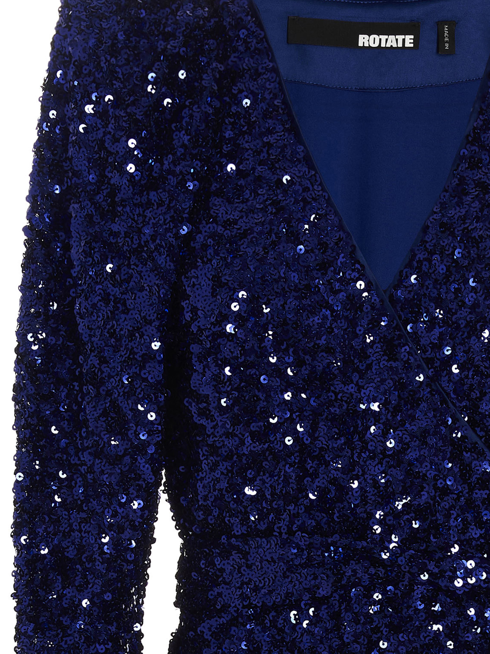 Maxi dress with all-over sequin appliqué, wrap tie closure, long sleeves and shoulder pads. Sequins sewn one by one. Any imperfections should not be considered defects.