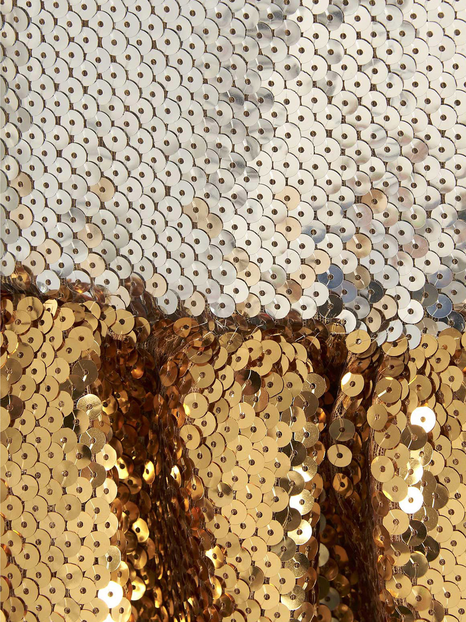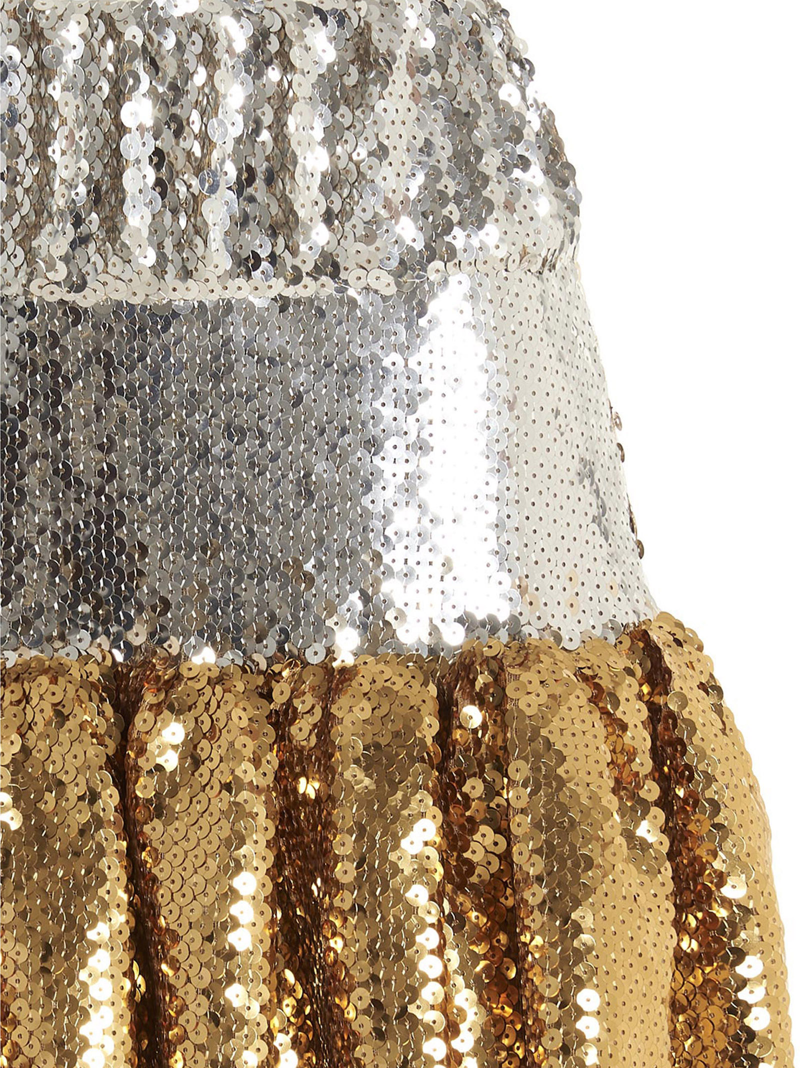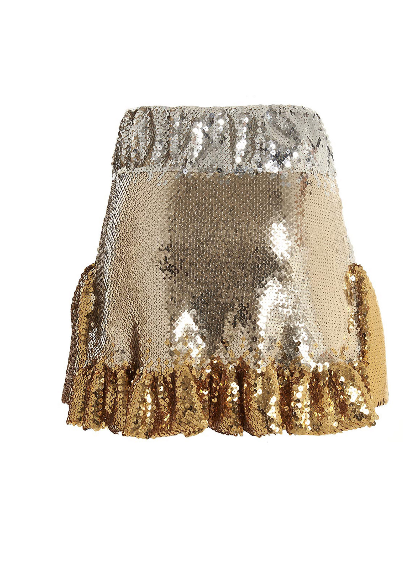 Short skirt with gold and all-over silver sequin appliqués, side zip closure and flounced bottom hem.