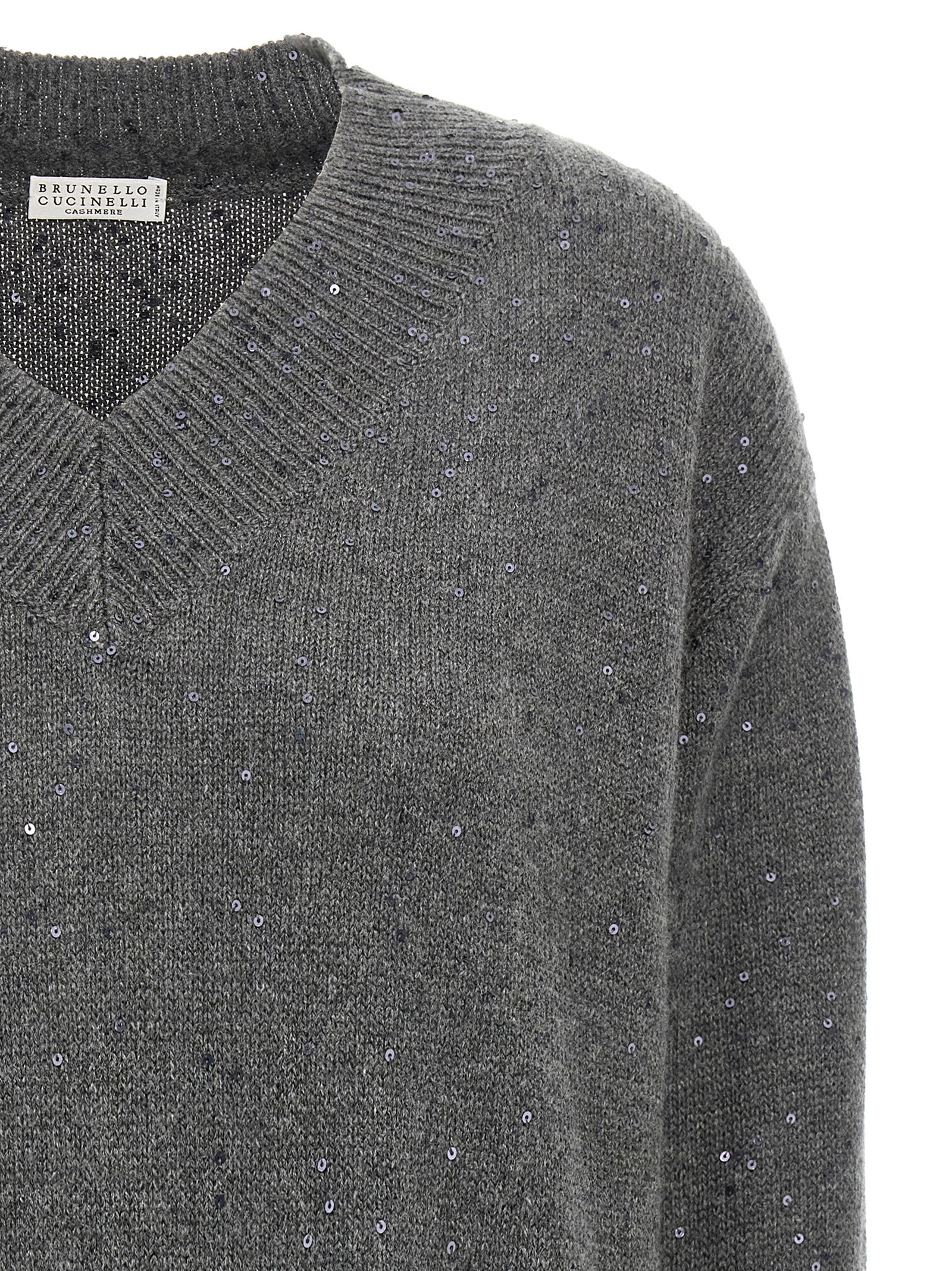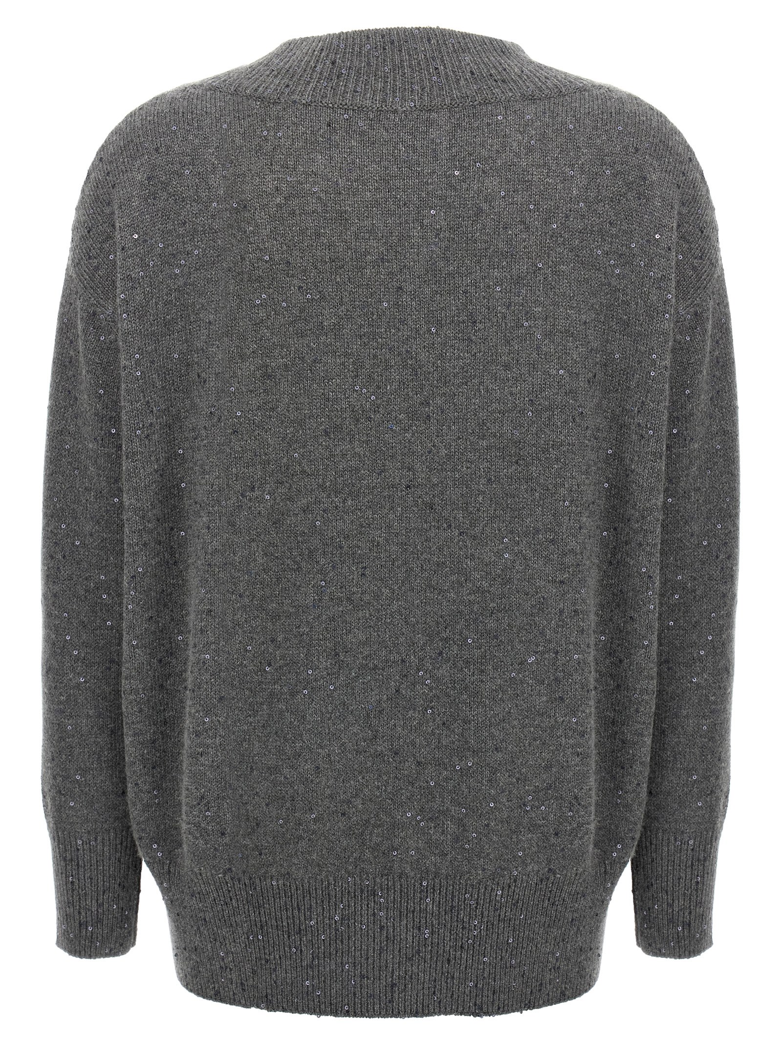 Cashmere and silk blend sweater with all-over sequin appliqué, V-neck, long cuffed sleeves and a dropped shoulder.