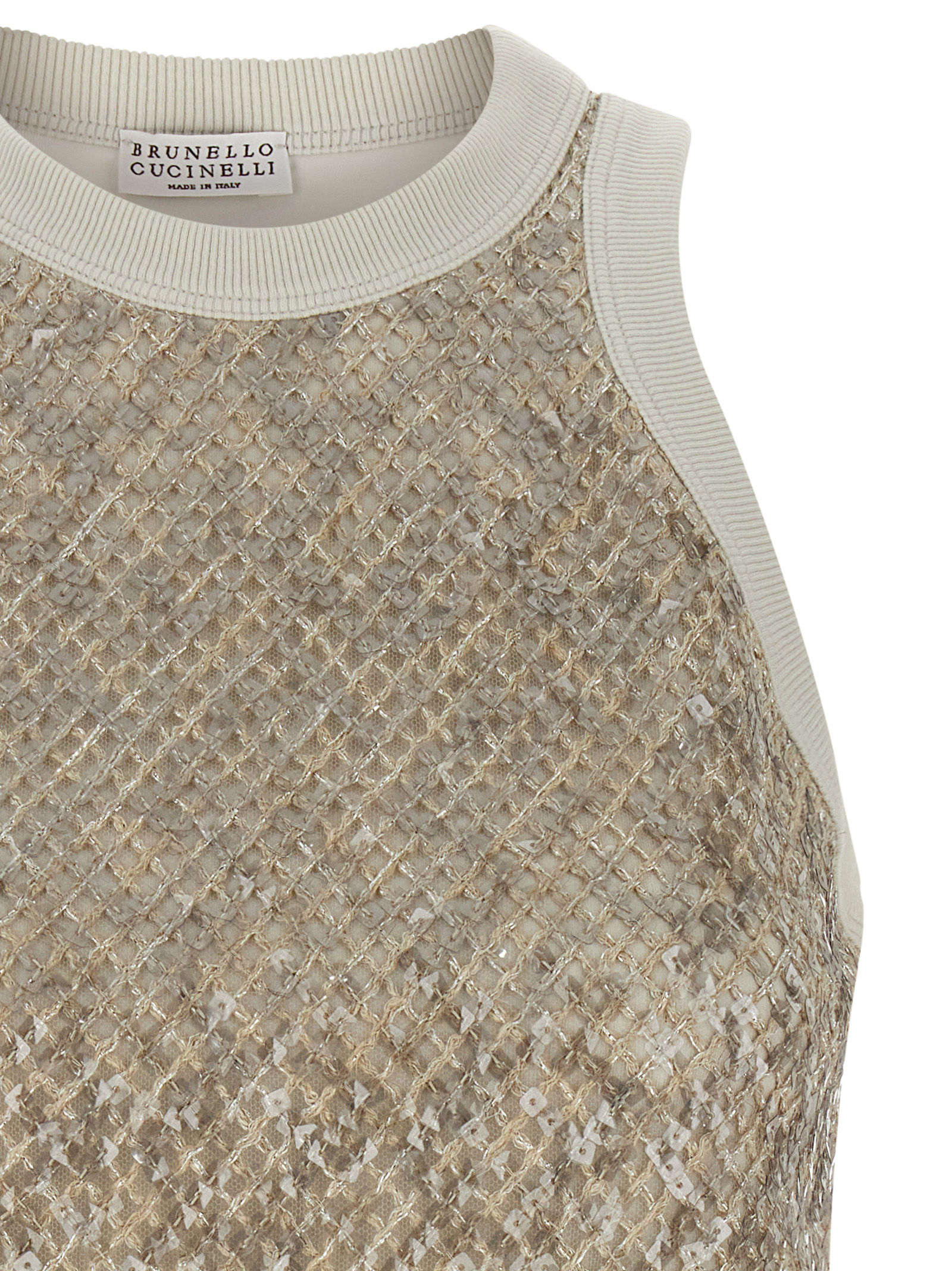 Cotton top with front fully embroidered in sequins and wool.