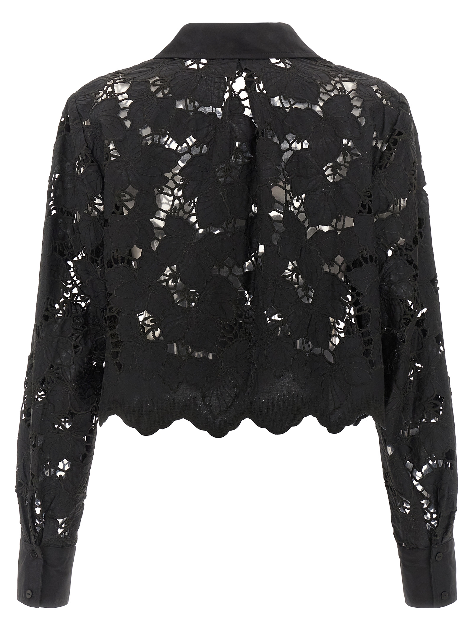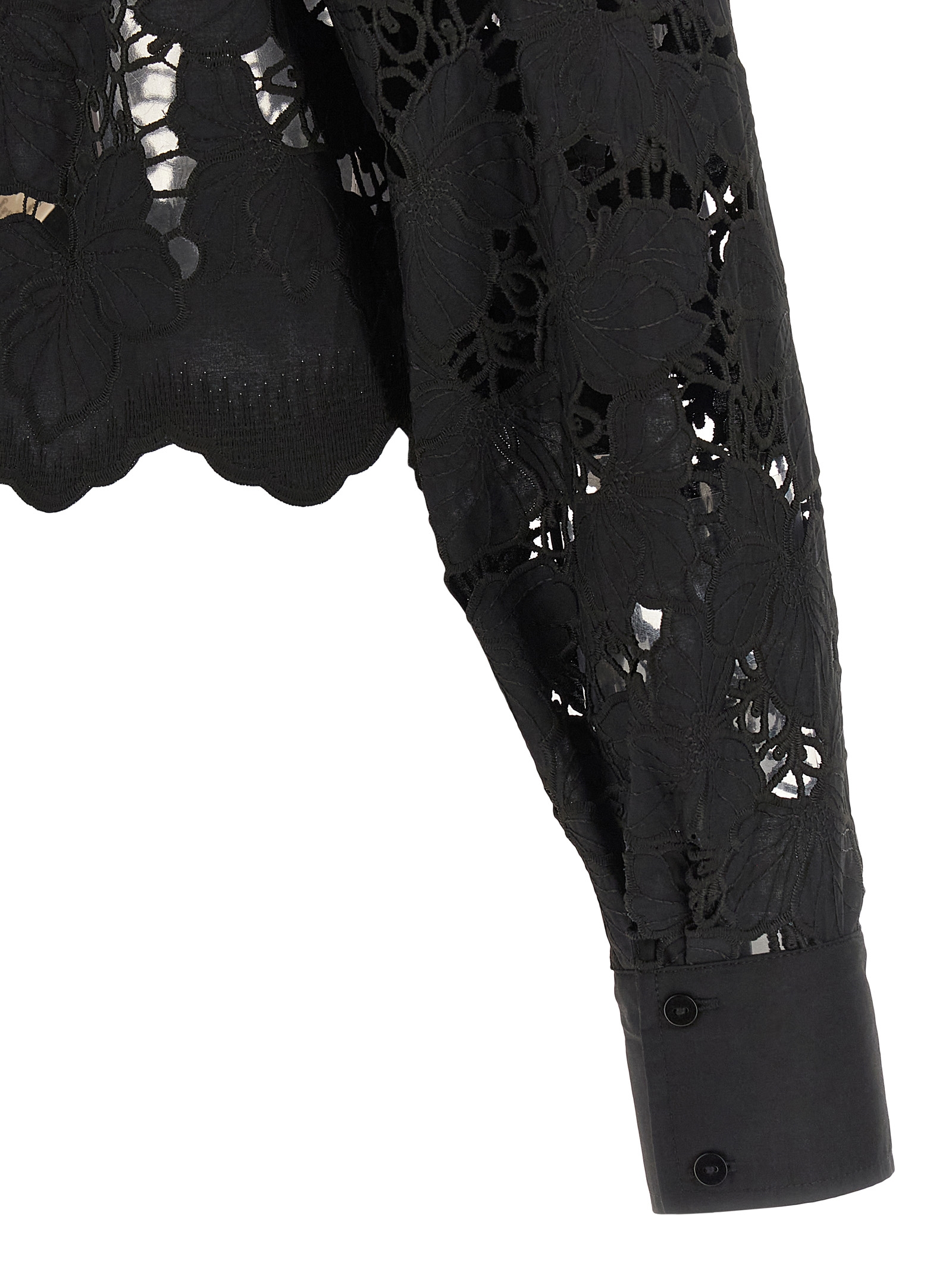 Poplin lace ‘Seychelle’ shirt Cotton unlined, crop style, front button closure, long cuffed sleeves, asymmetric hem.