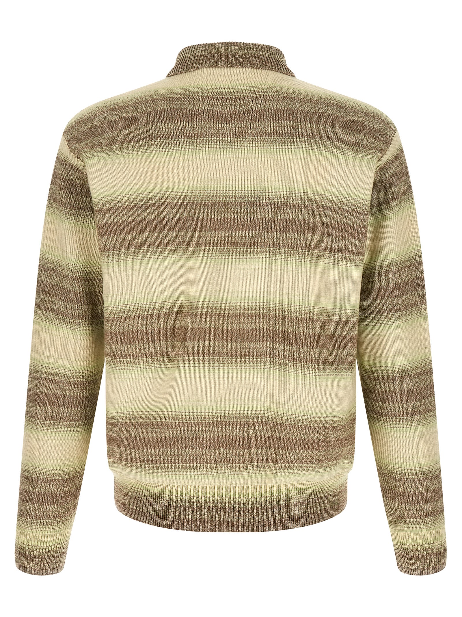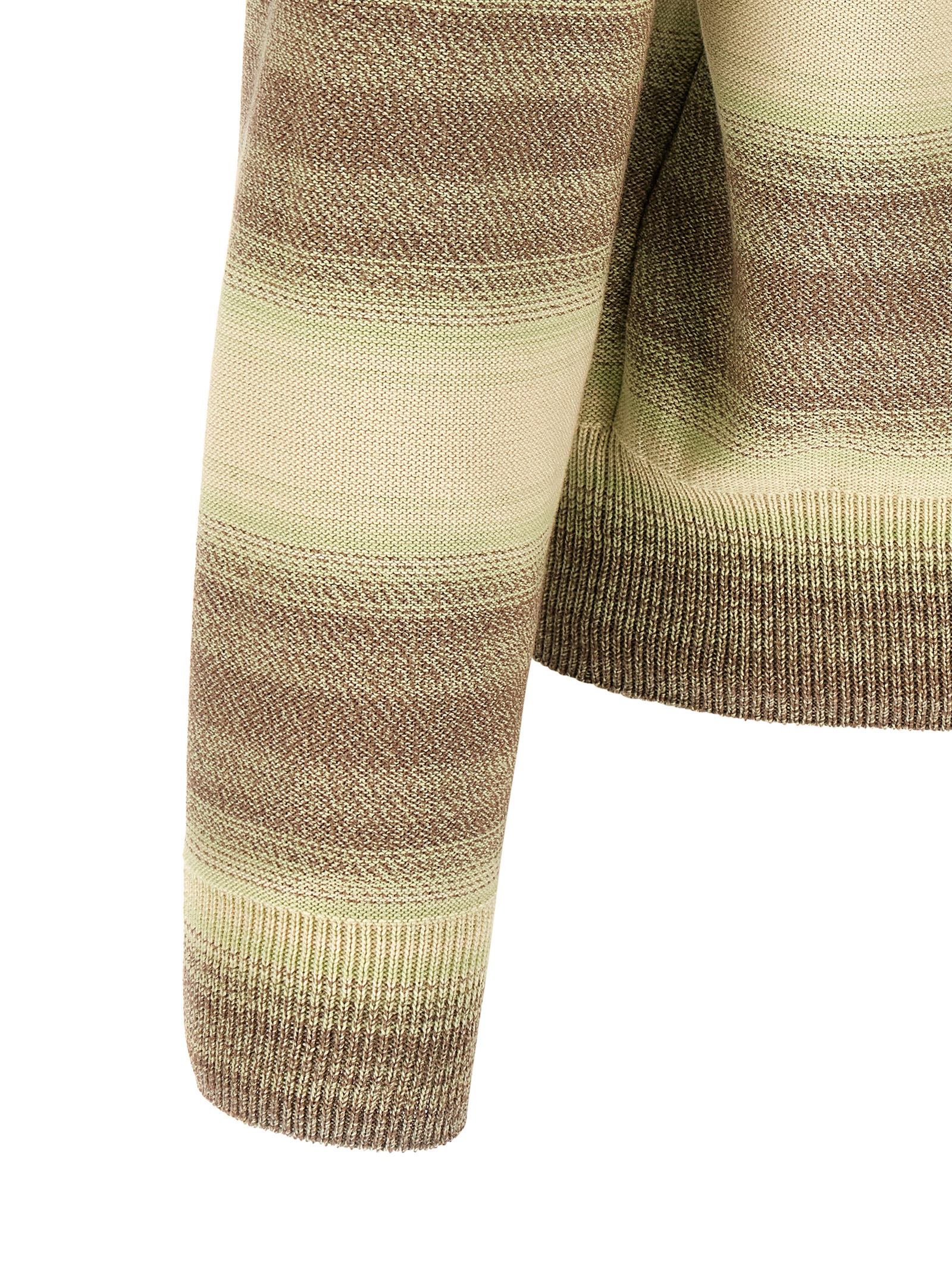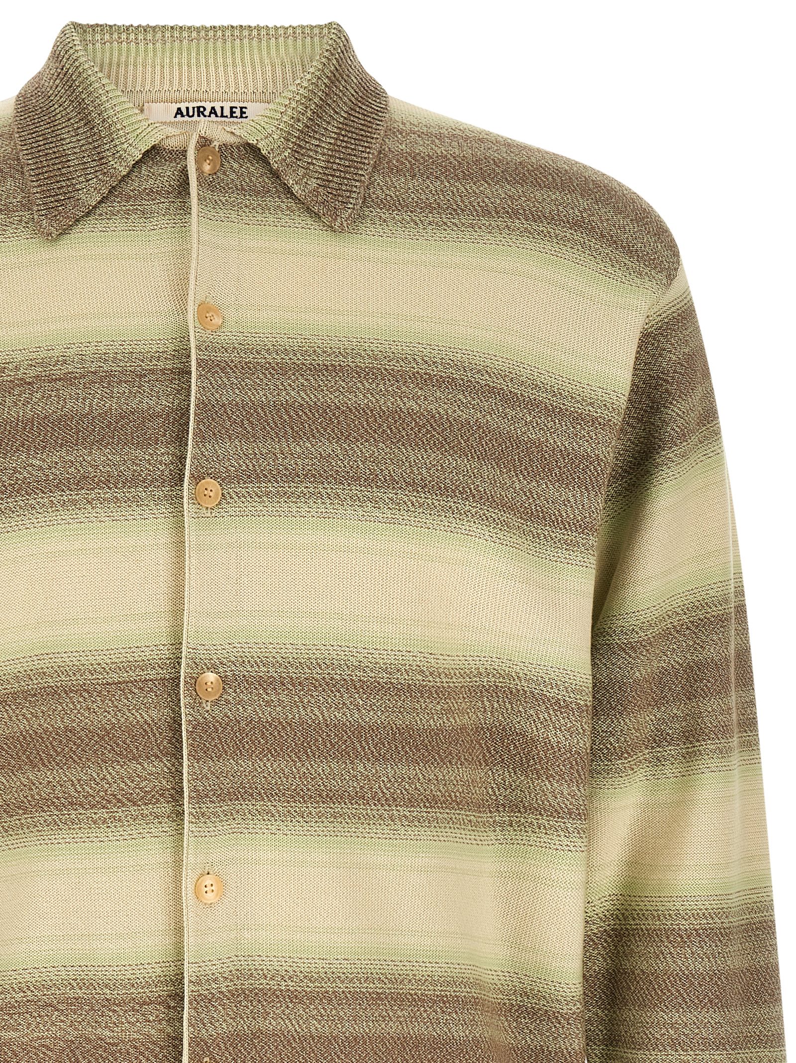 Cardigan in high twist cotton and silk blend yarns with gradient stripes, shirt collar, front button closure, long sleeves with cuffs and dropped shoulders, band on the hem.