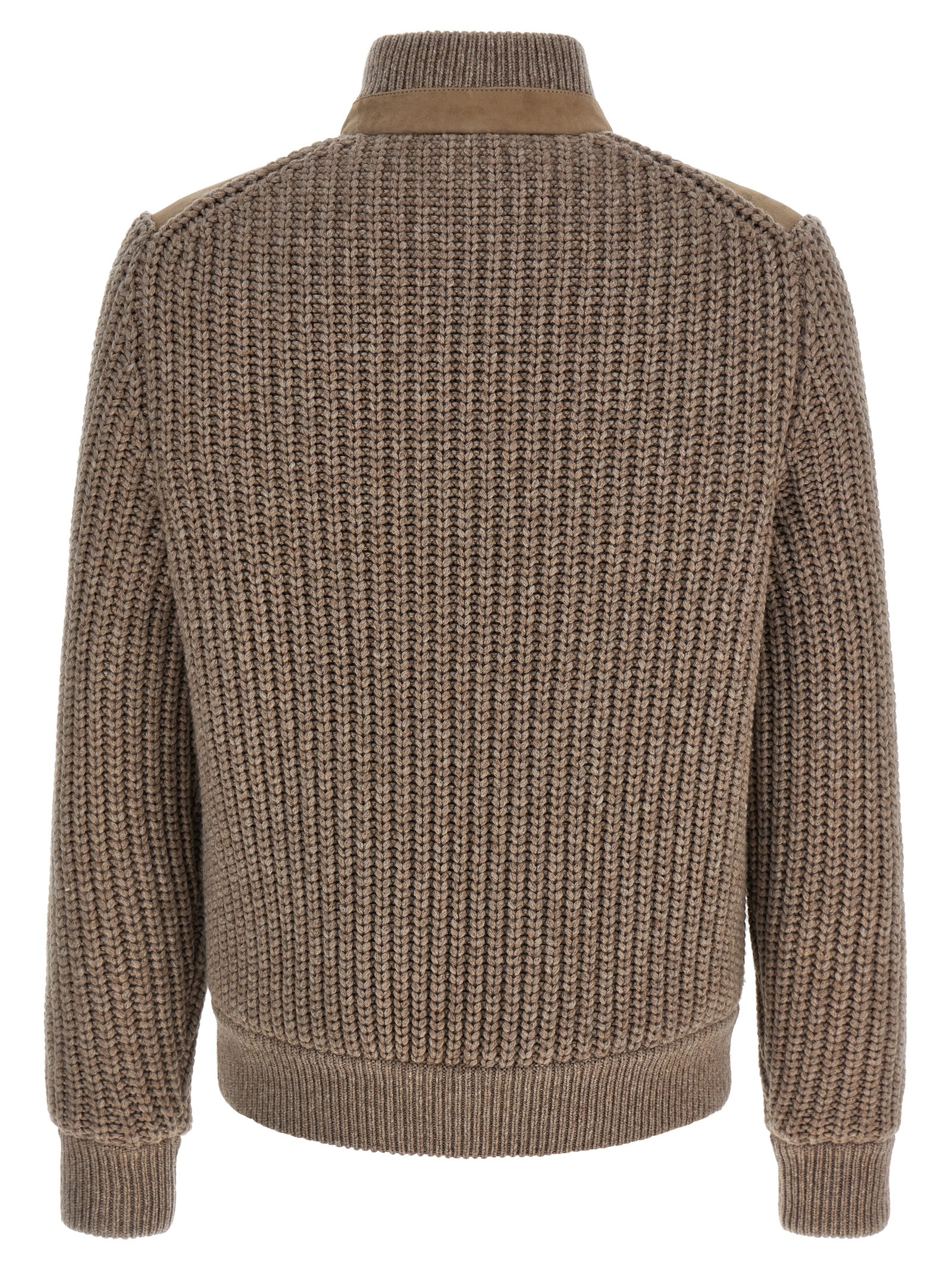 Cashmere knit bomber jacket with suede insert on the front and shearling lining, Thermore® padding, high neck, front metal button closure, pockets, long cuffed sleeves.