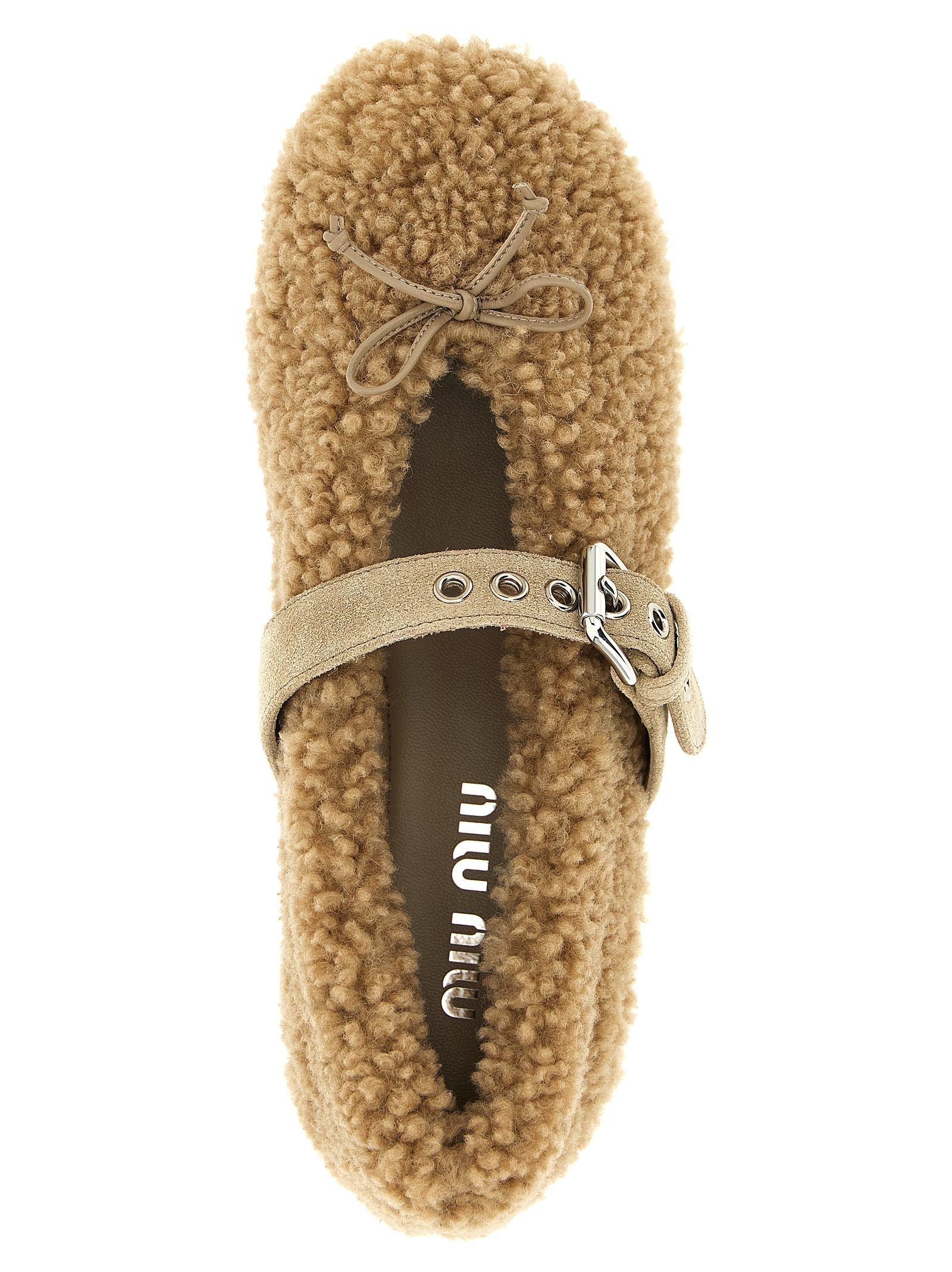 Sheepskin ballet flat, rounded toe with tone-on-tone leather bow detail on the front, adjustable suede strap on the instep, rubber sole.