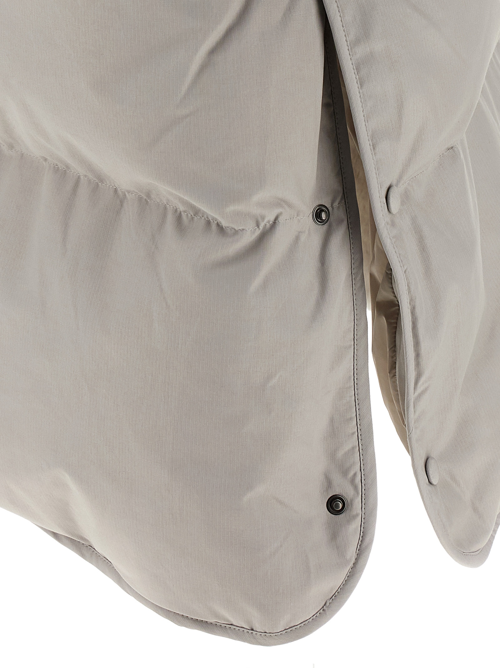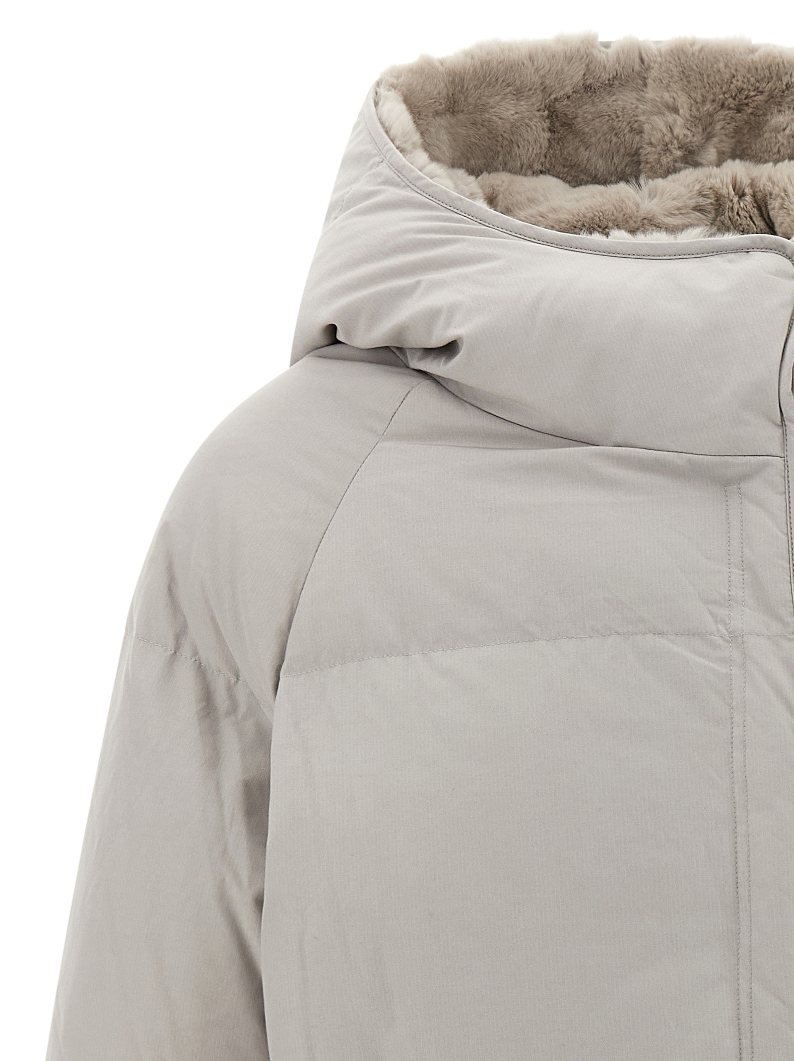 Long down jacket in quilted technical fabric with goose feather padding, hood and front part with inner shearling inserts, high neck, zip closure, pockets, long sleeves, side slits with snap buttons.