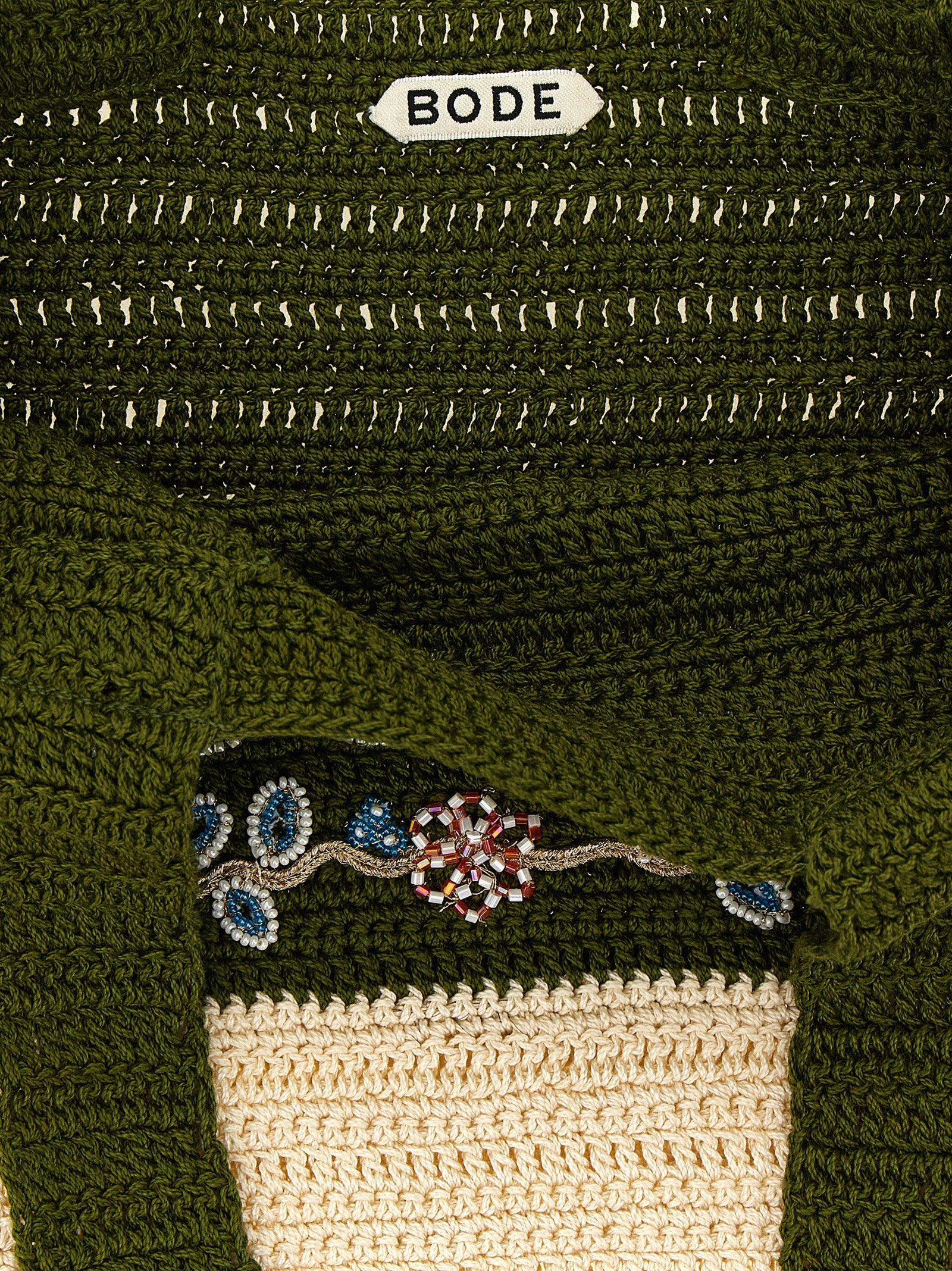 ‘Sherbet’ handmade crochet shopping bag with a dry cotton yarn, floral embroidery of front beads, tote model, double fixed handle, tassels on the bottom.