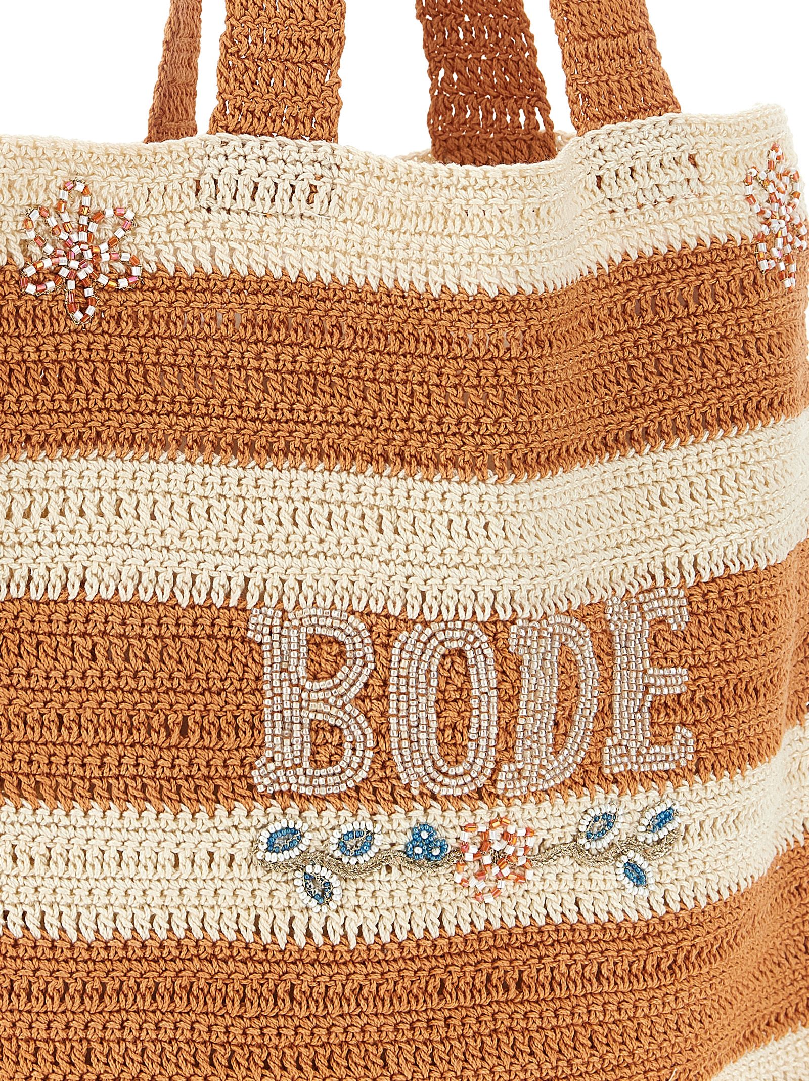 ‘Sherbet’ handmade crochet shopping bag with a dry cotton yarn, floral embroidery of front beads, tote model, double fixed handle, tassels on the bottom.