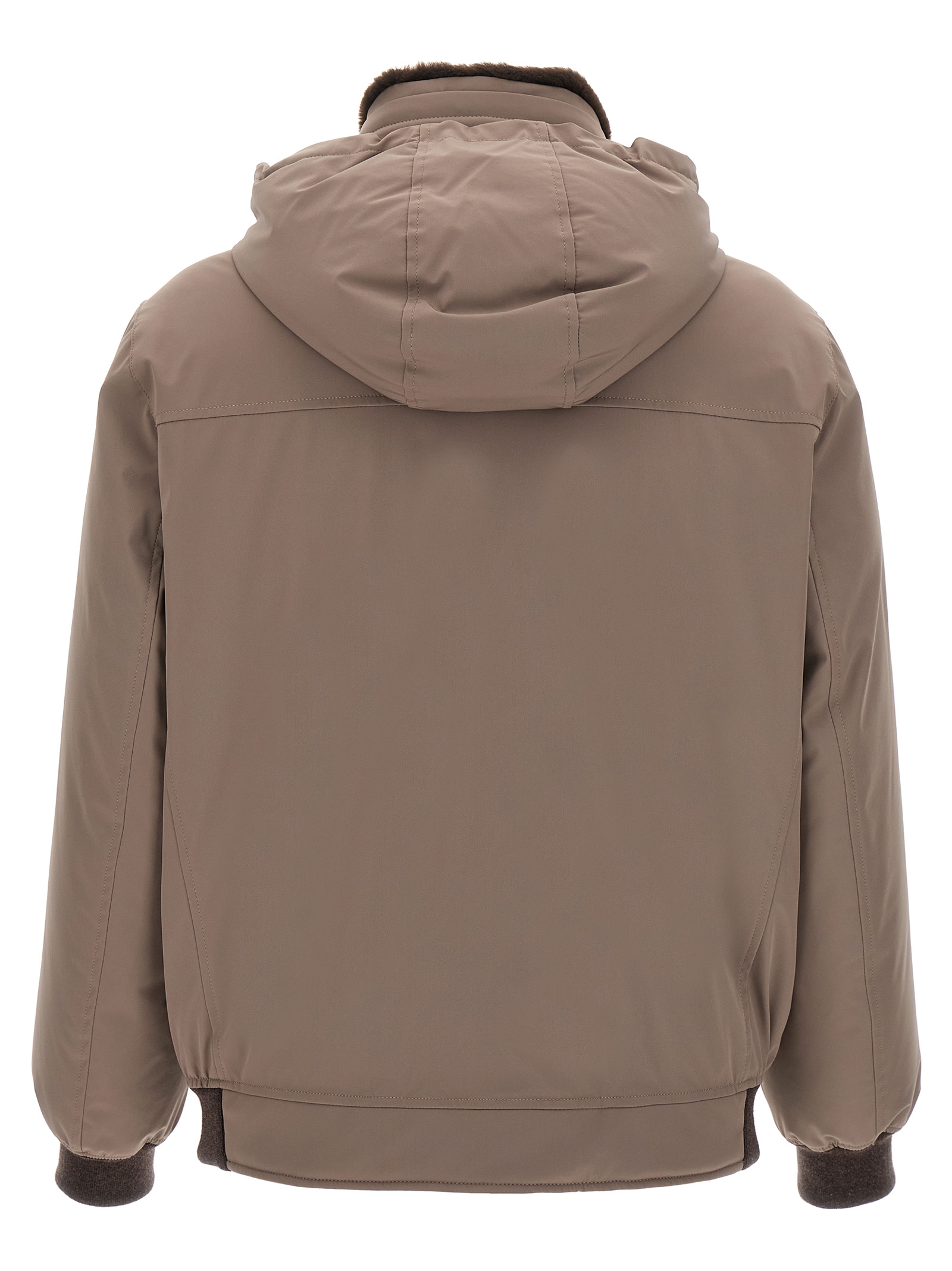 Water-repellent tech fabric bomber jacket, quilted lining with goose feather padding, stand-up collar with removable sherling lining, adjustable and removable hood, front zip closure, pockets, long sleeves with stretch ribbed knit cuffs.