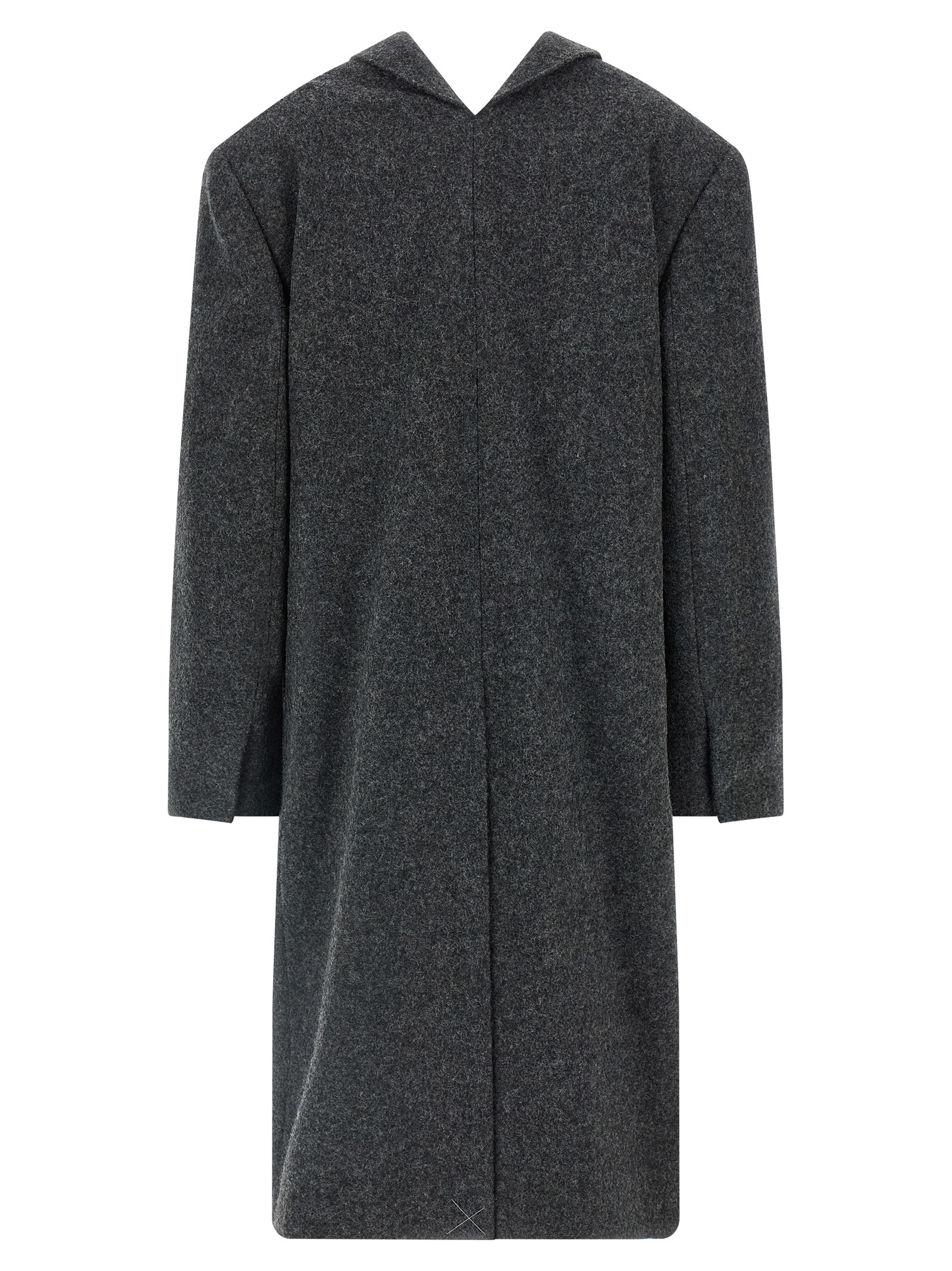 Shetland wool single-breasted coat with reverse applied collar with jewel snap button closure, pockets, structured shoulder strap, long sleeves with split on the cuffs and back split.