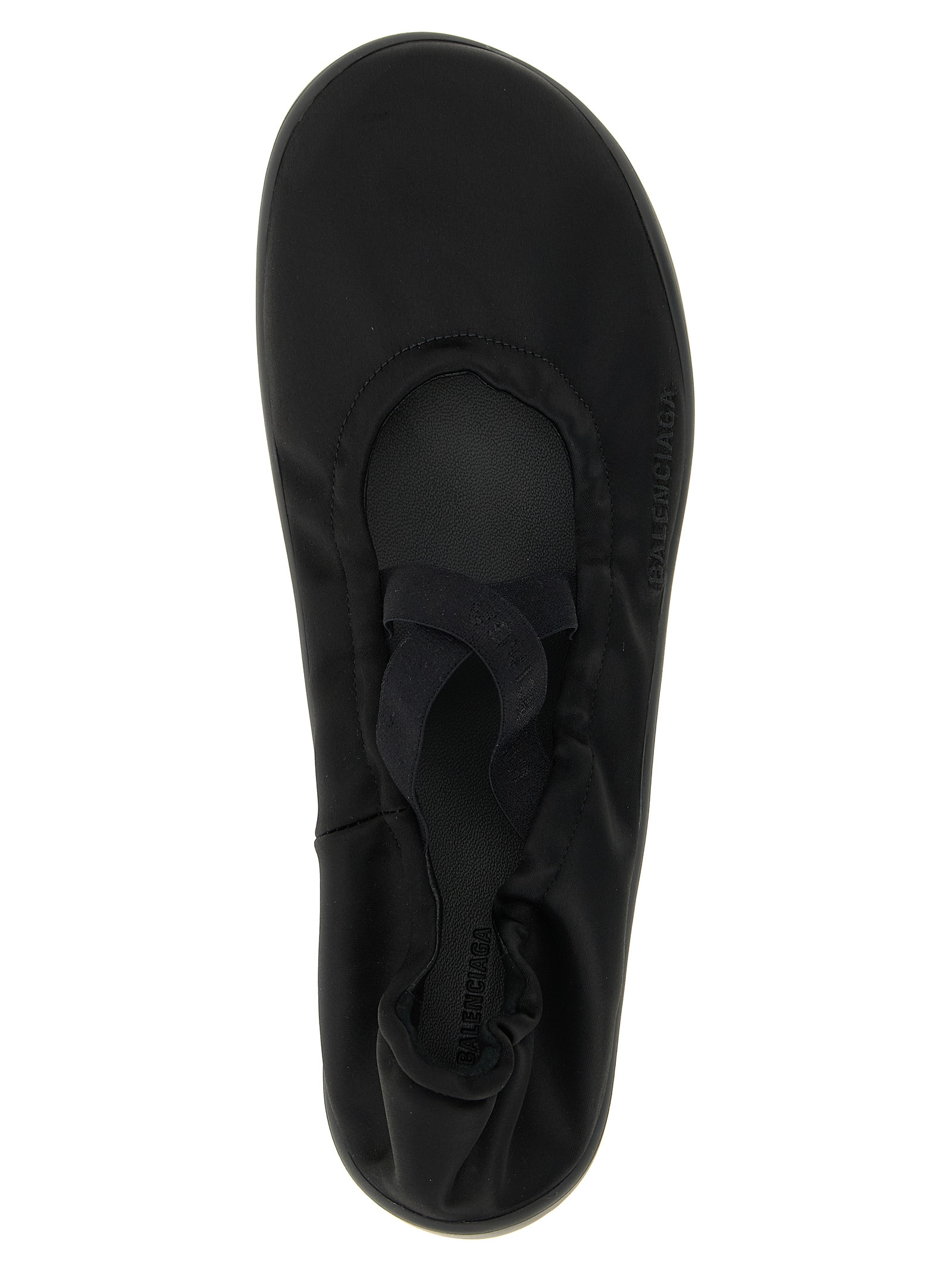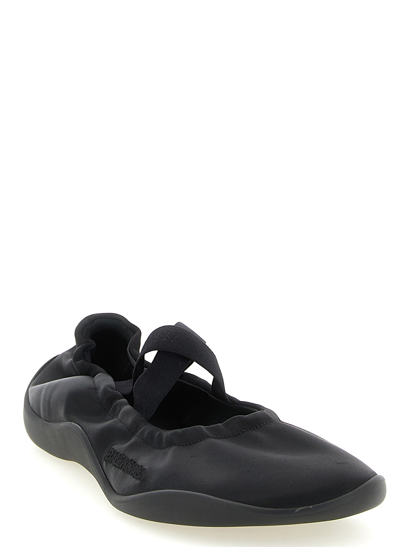 Shibuya’ satin ballet flats with round toe, crossed elastic bands on the instep, tone-on-tone lettering embroidery on the side, lambskin insole, ergonomic TPU sole.