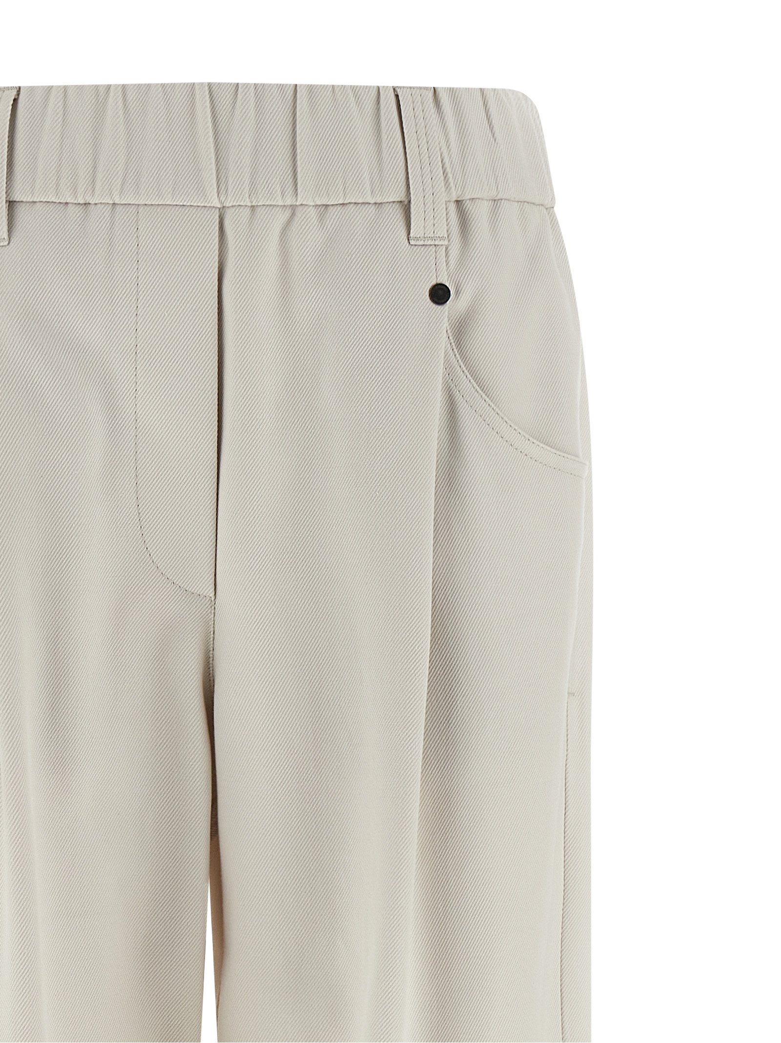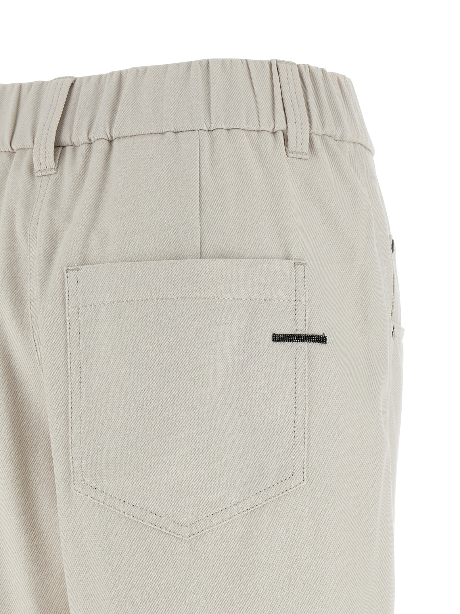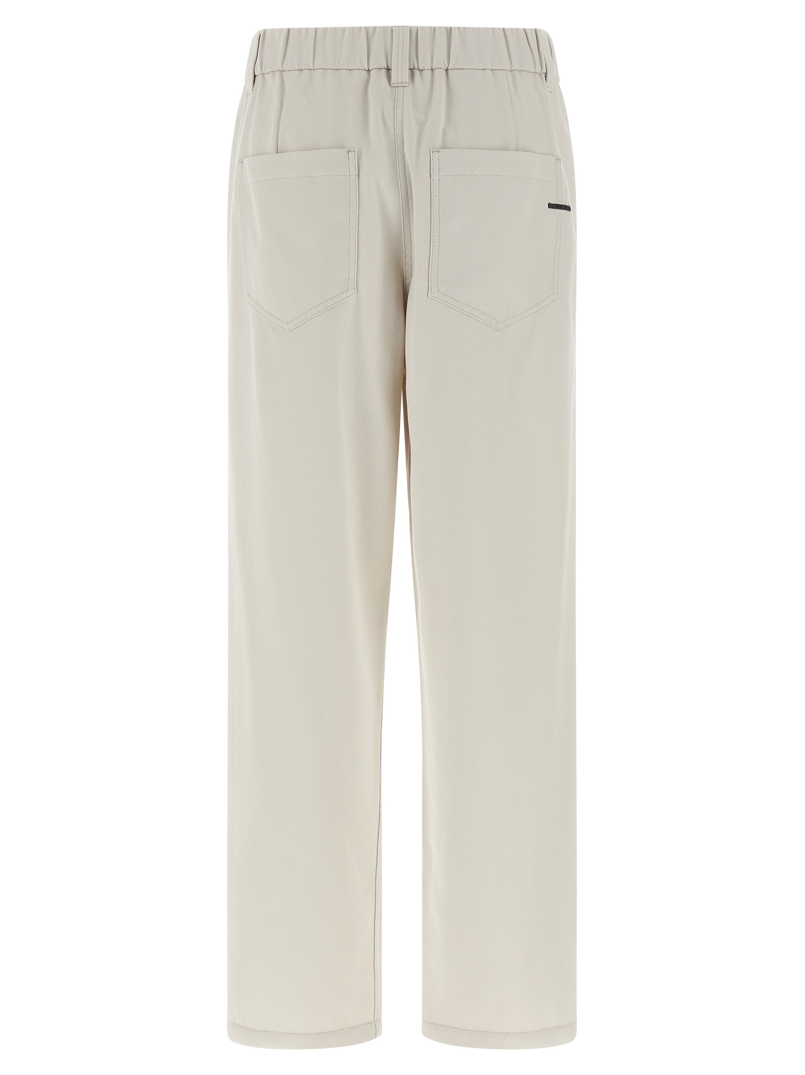 Pull-On pants in stretch cotton cover, ‘Shiny Bartack’ detail in back jewelry, elastic waistband, trompe l’oeil flap, five pockets, straight leg, pins, turn-up on the leg bottom.