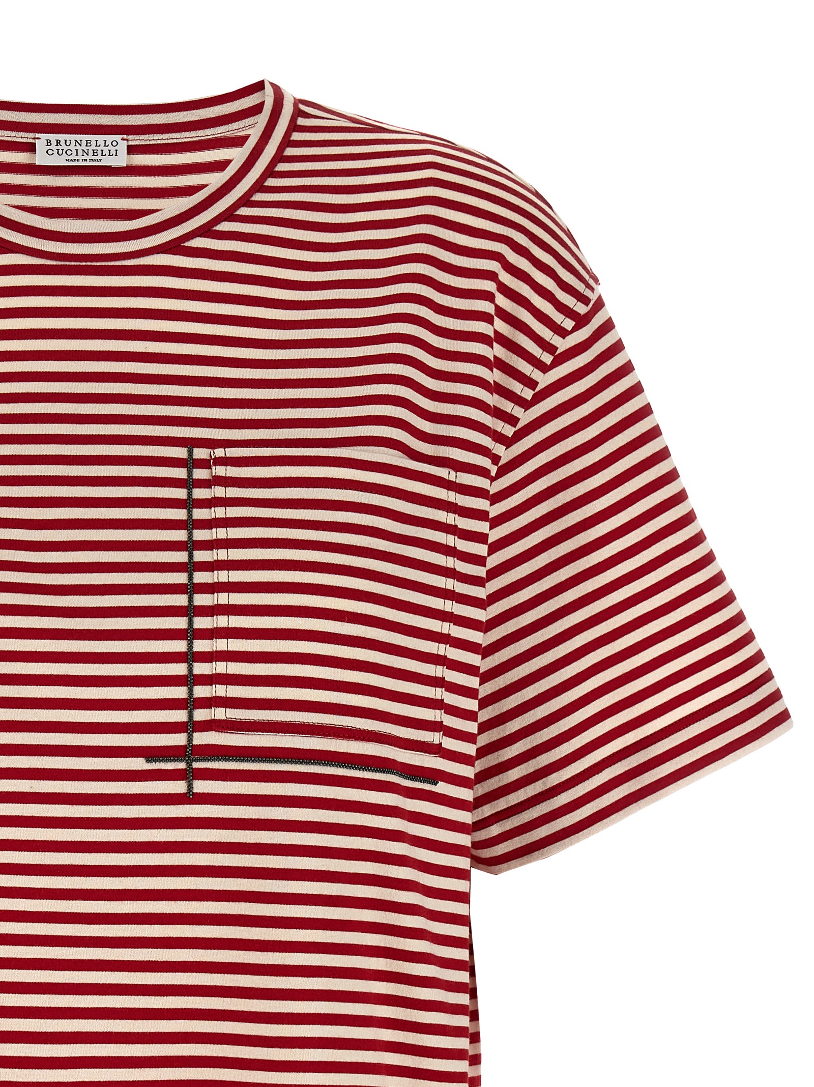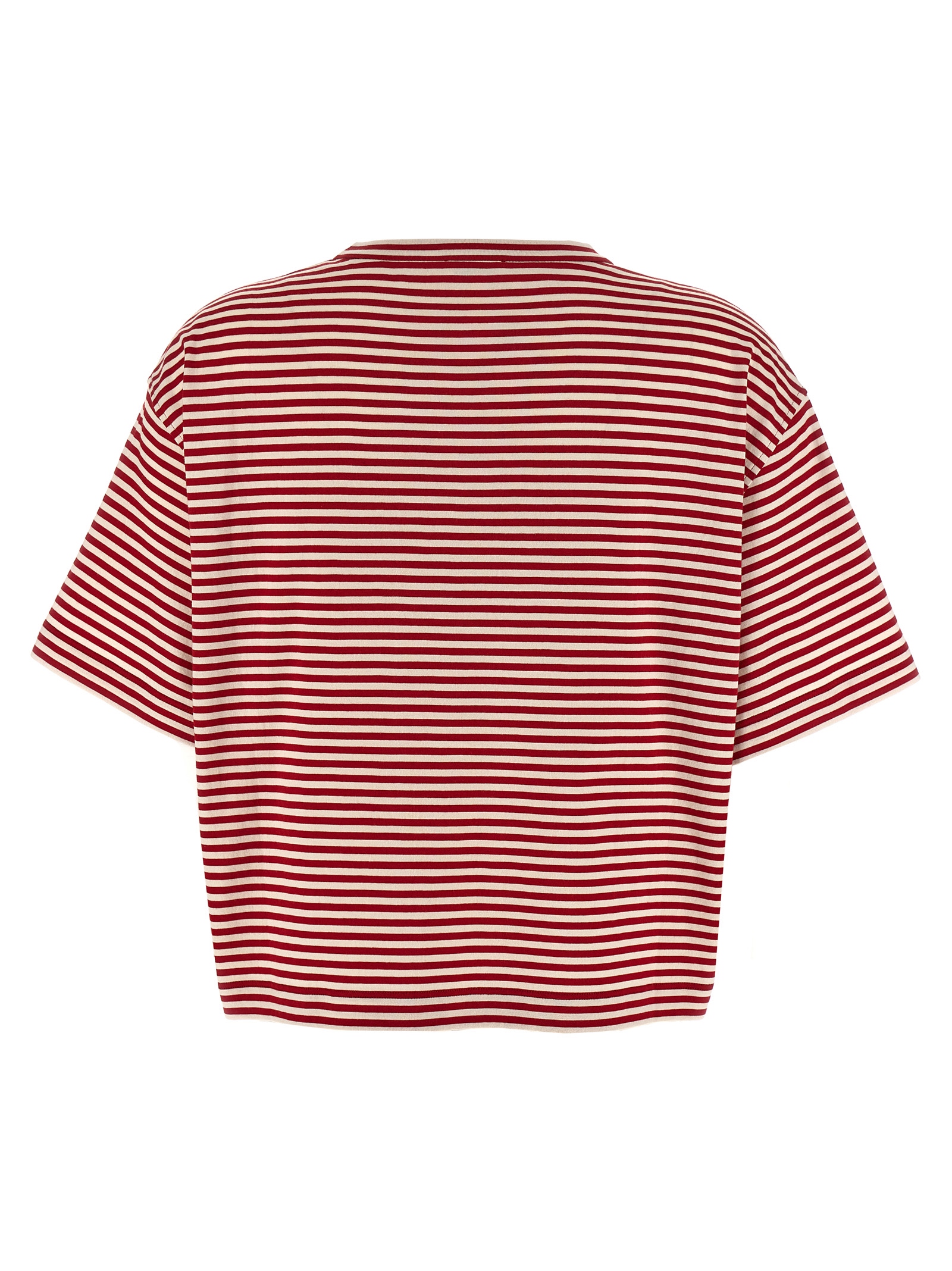 Striped cotton jersey cropped T-shirt, breast pocket with Monile ‘Shiny Pocket Detail’, crewneck, and short sleeves with dropped shoulders.