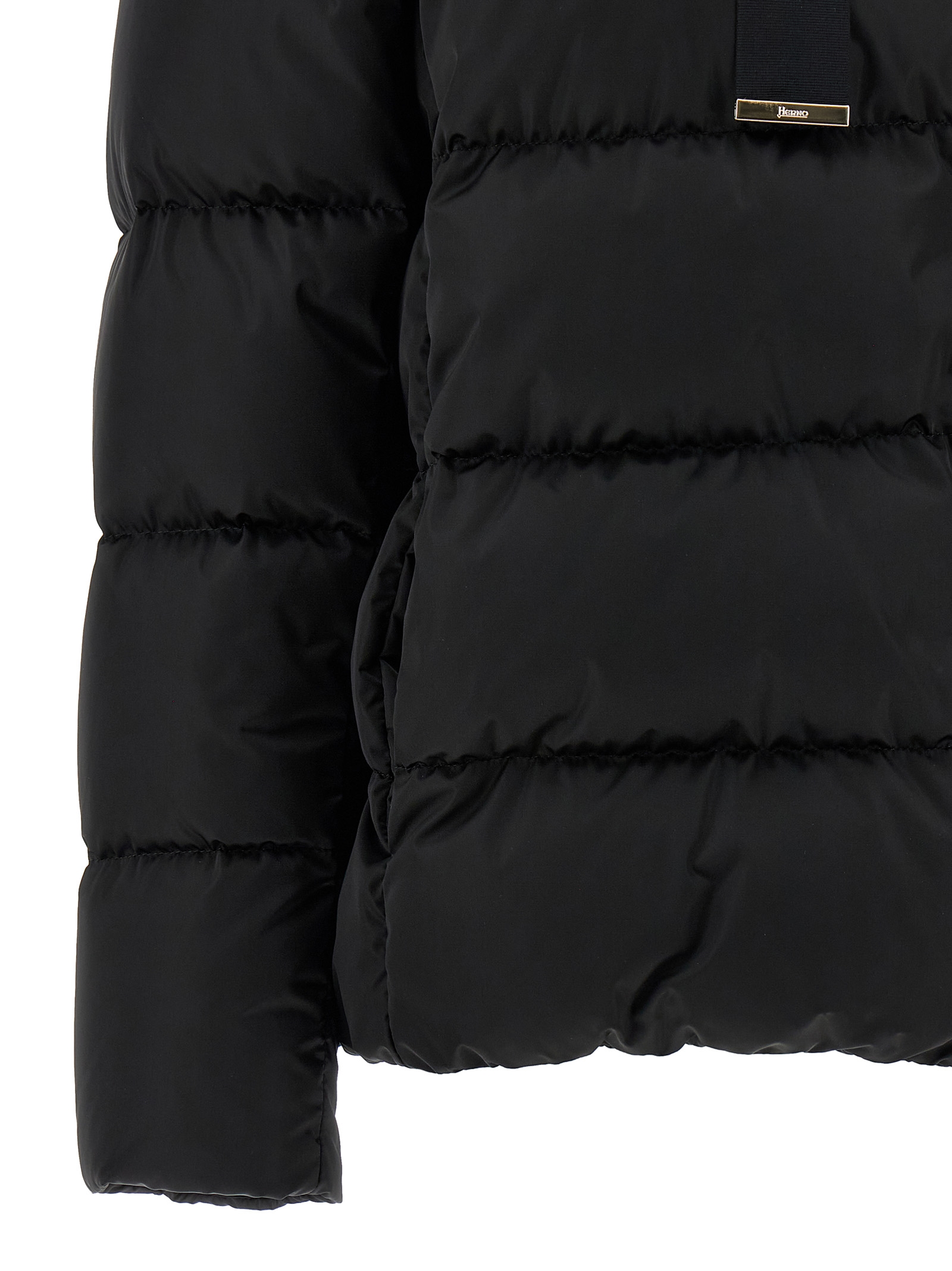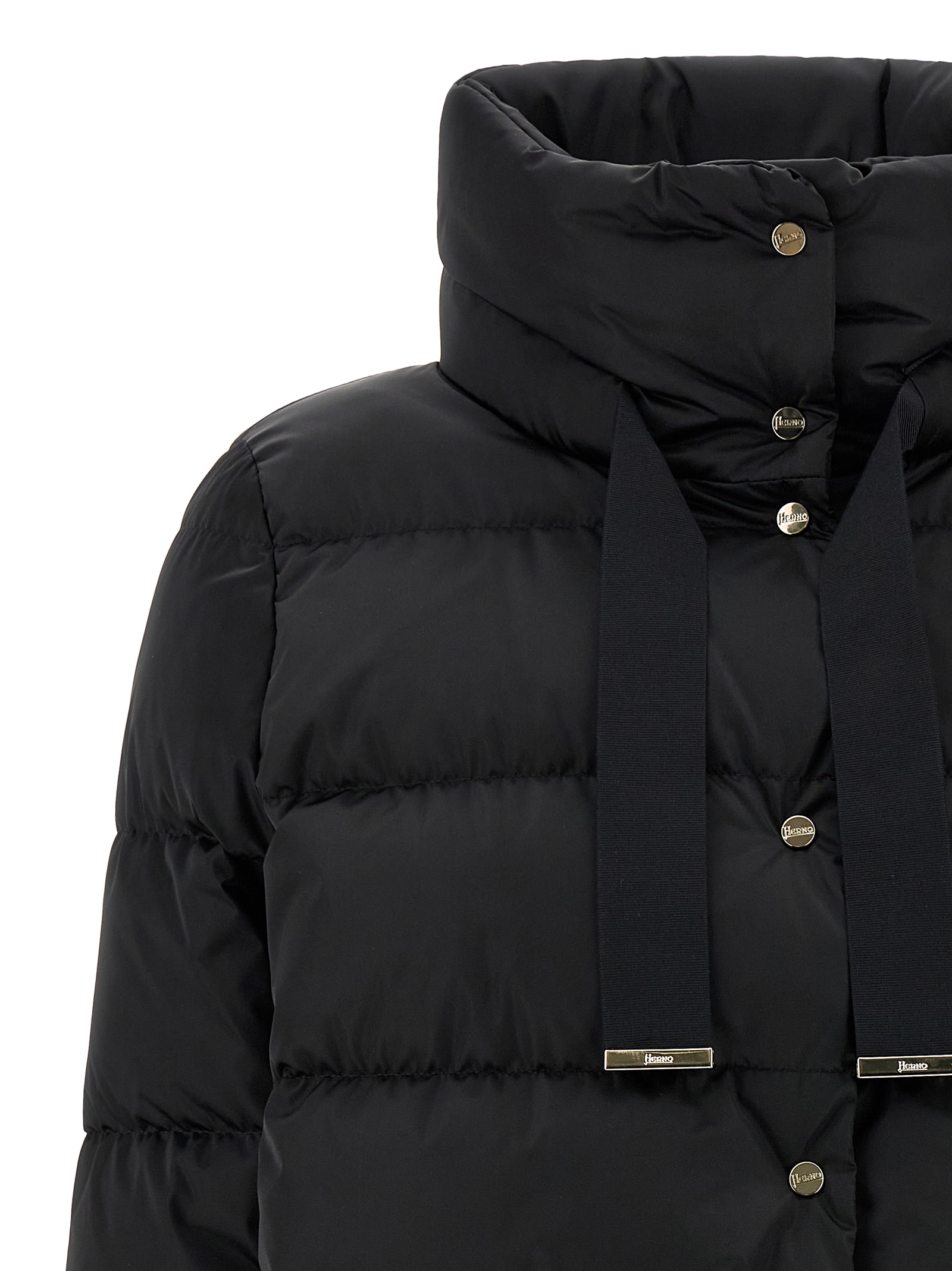 Quilted and goose feathered high-density shiny satin down jacket, crater high neck with tone-on-tone grosgrain tape drawstring, snap button closure, pockets, long sleeves.