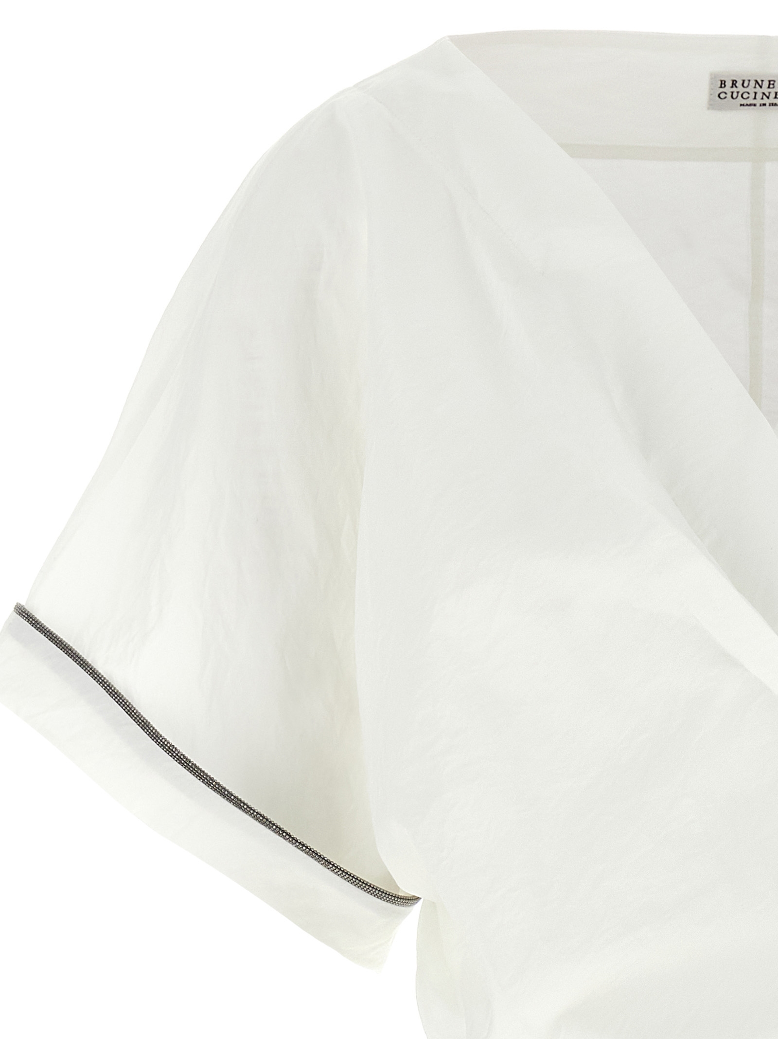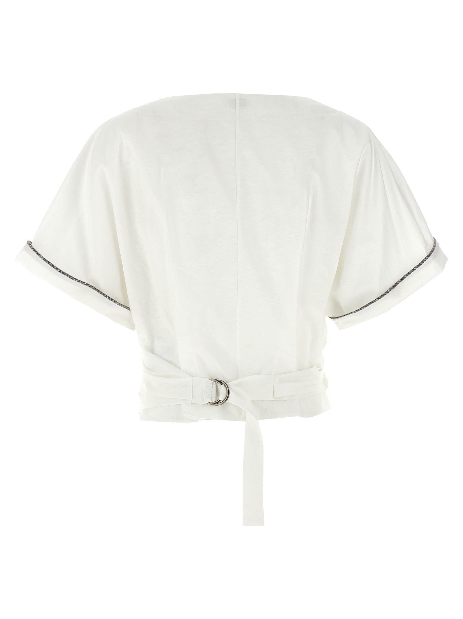 Kimono top in techno cotton poplin with wrap closure with pull belt, wide short sleeves with ‘Shiny Trims’ Monile detail.