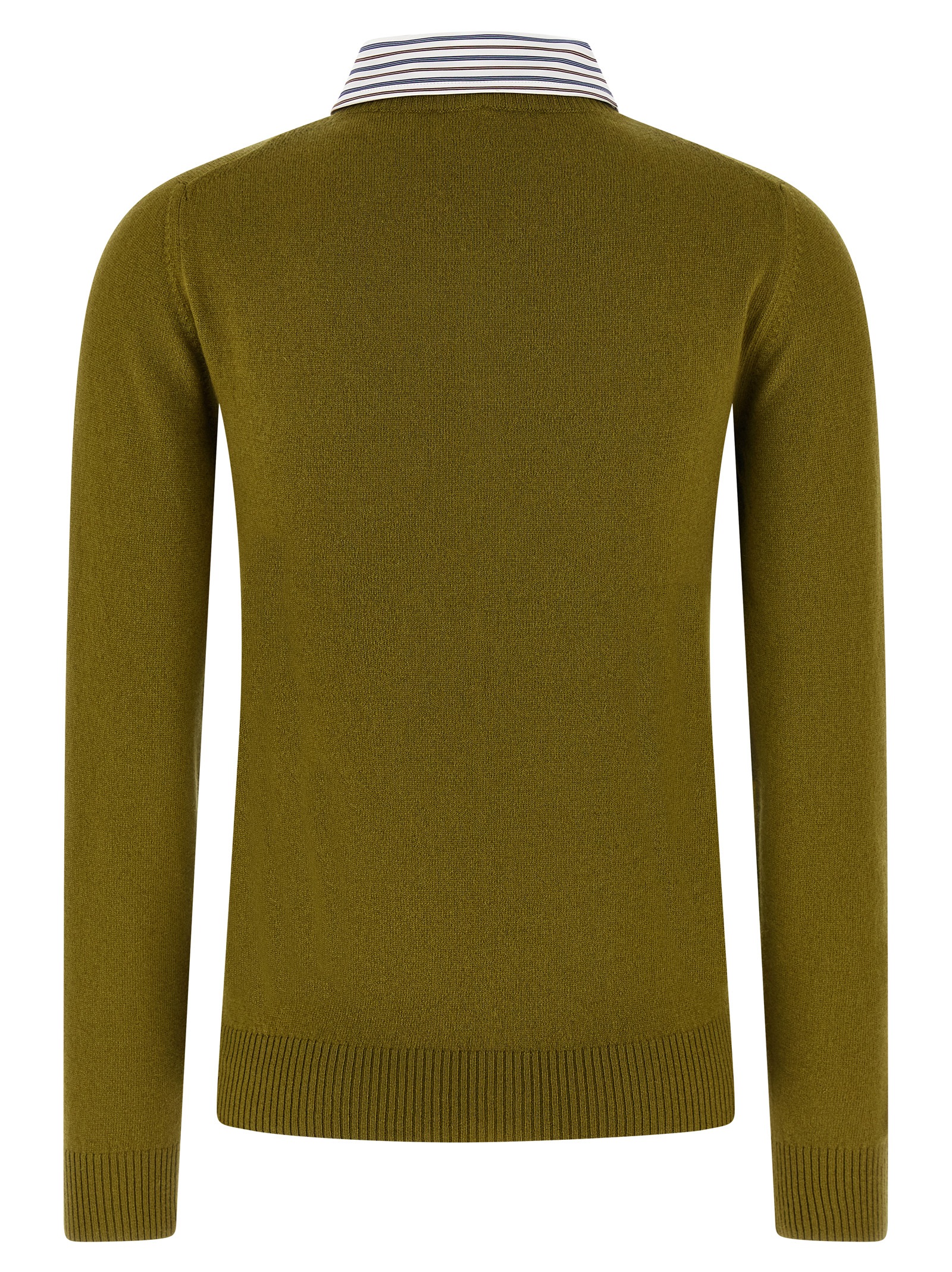 Cashmere cardigan, removable striped cotton poplin shirt collar, jacquard logo and front button closure, long cuffed sleeves.