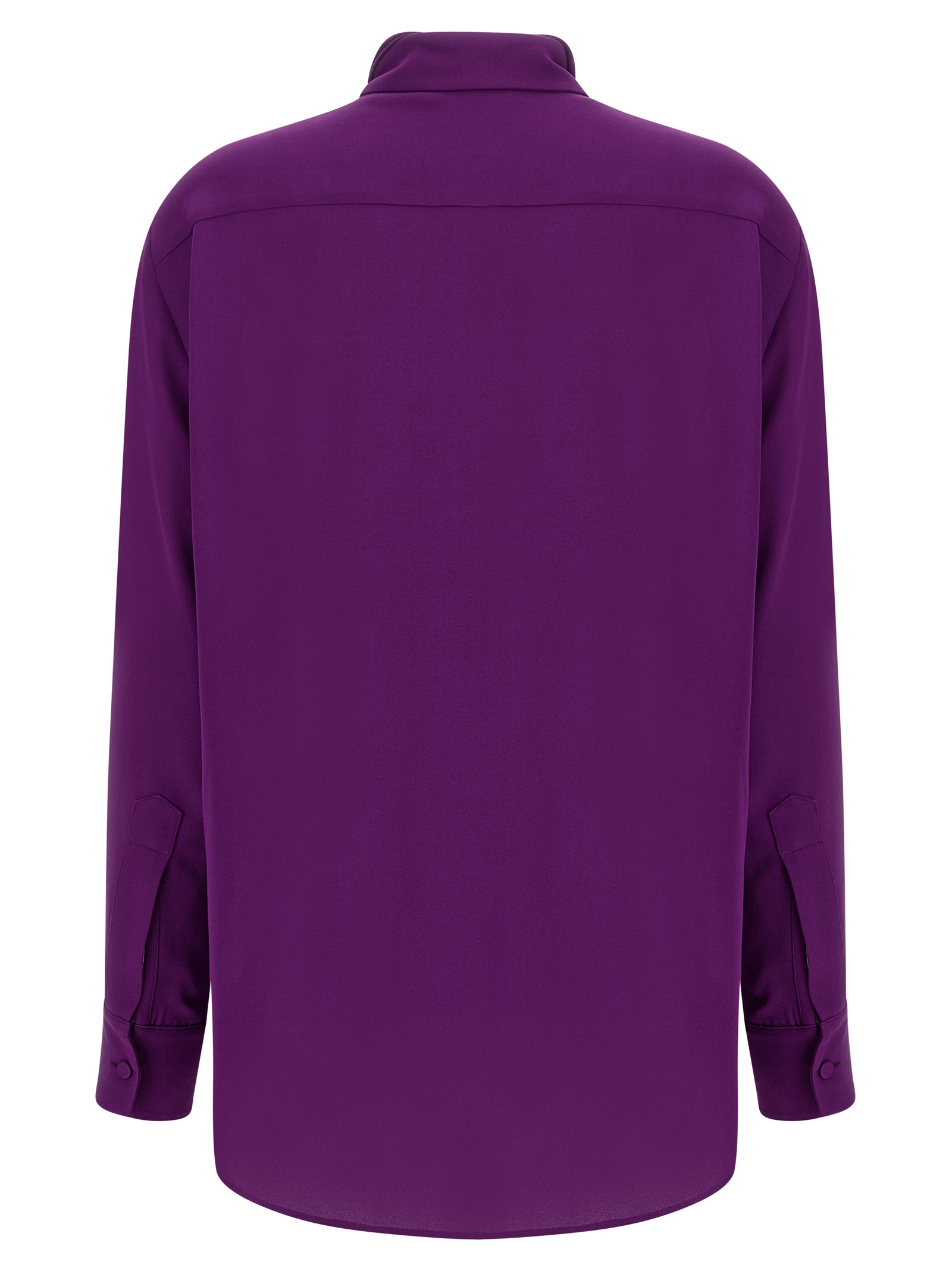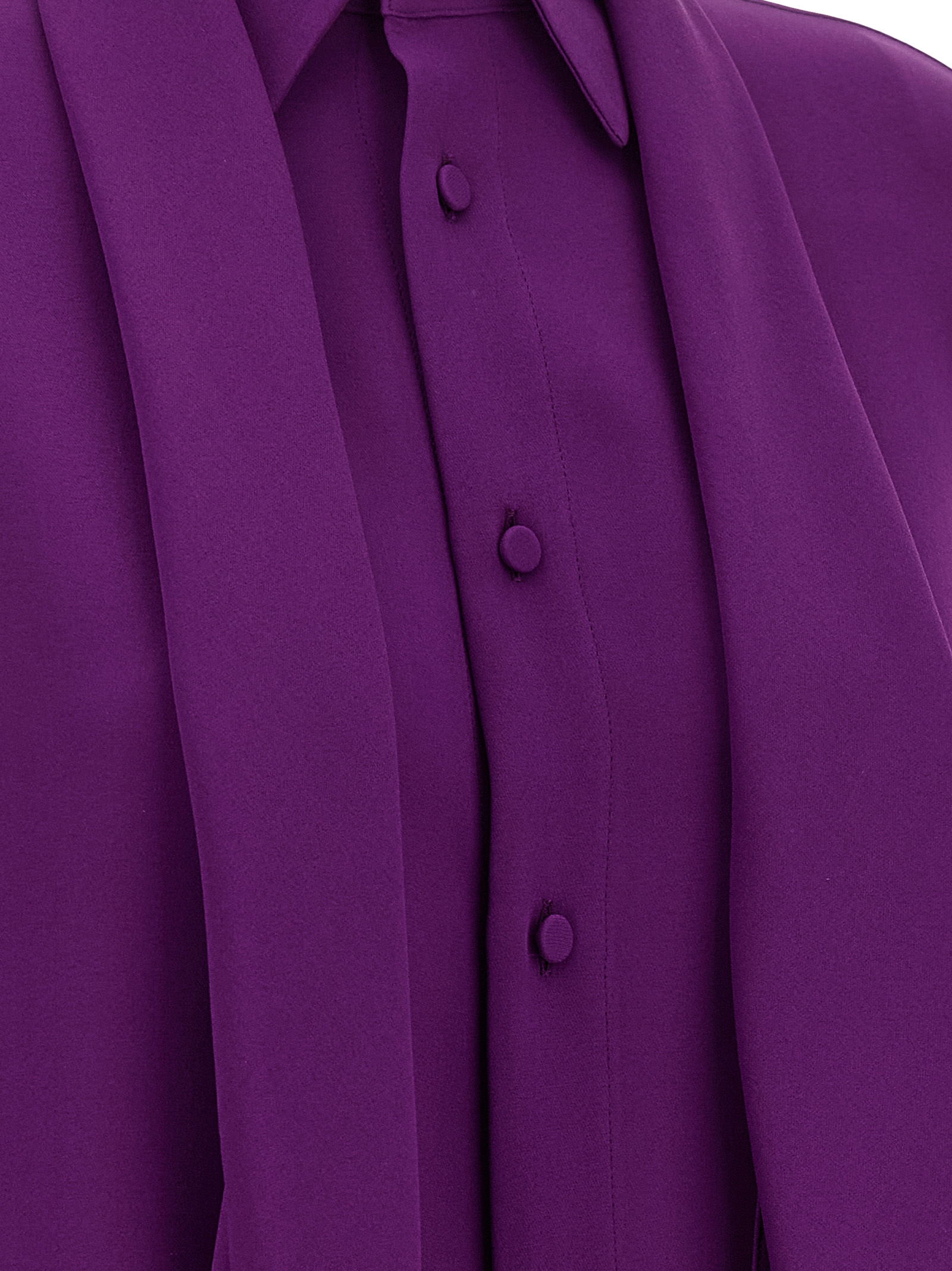 Silk georgette shirt with removable matching scarf collar, front covered button closure, long sleeves with cuffs and dropped shoulders, rounded and asymmetrical hem.