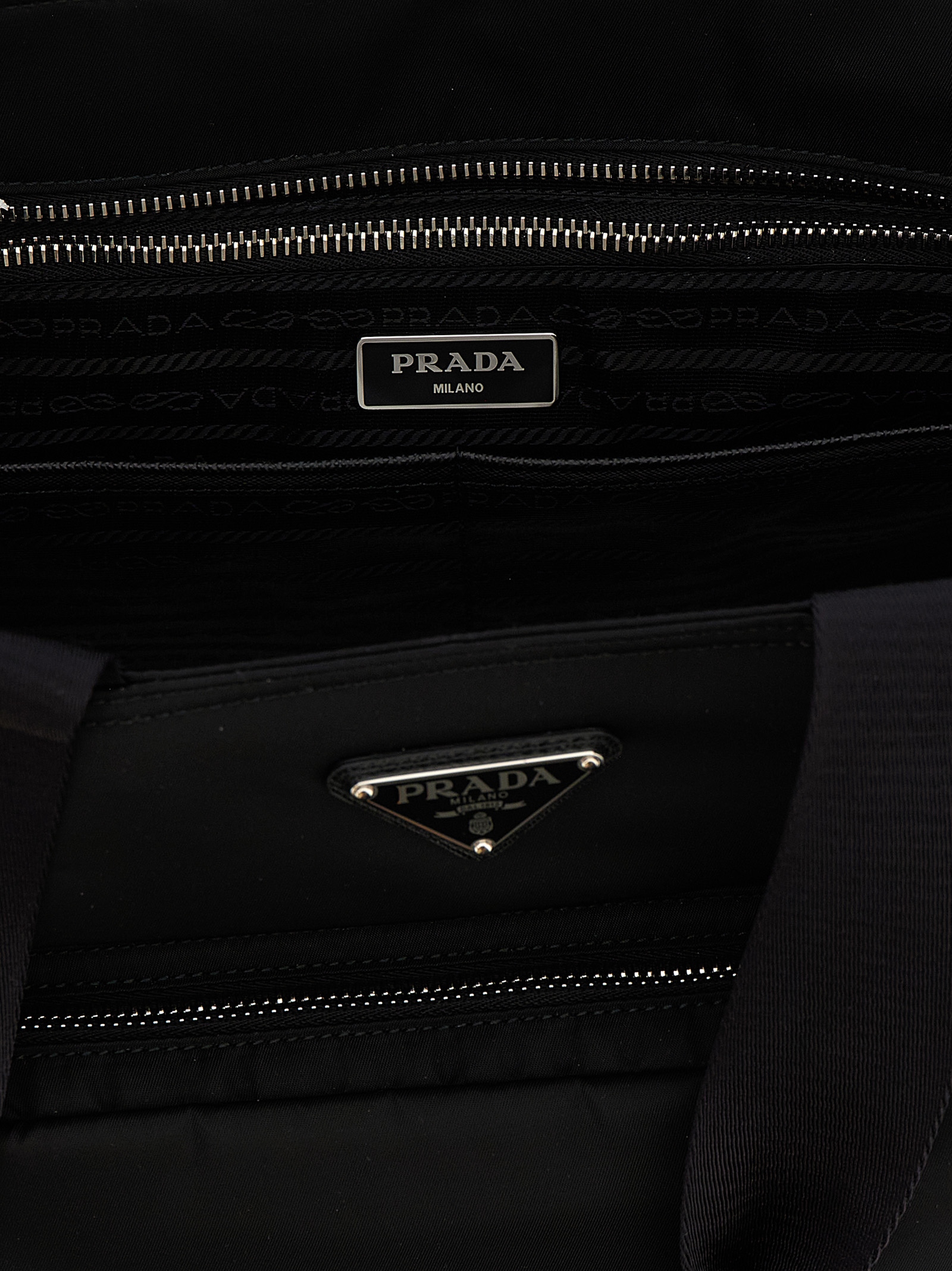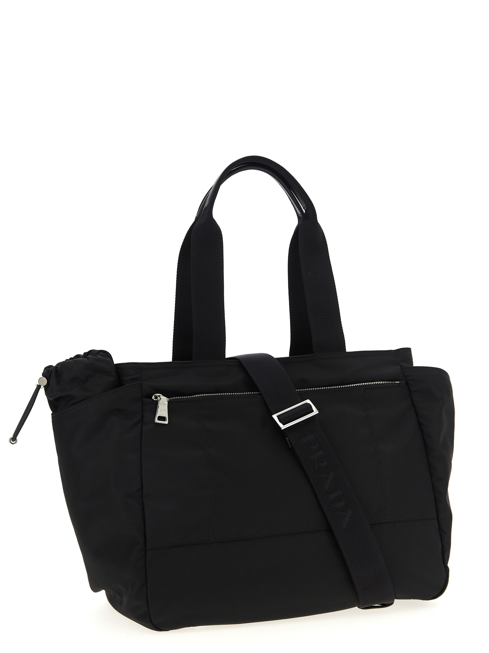 Shopping ‘Prada Baby Bag’ made of Re-Nylon, enameled metal triangle logo on front, double fixed fabric handles with Saffiano leather protection, top zipper closure, front zippered pocket and mat inside, open side pockets, back zippered pocket, removable bottle holder, adjustable and removable shoulder strap.