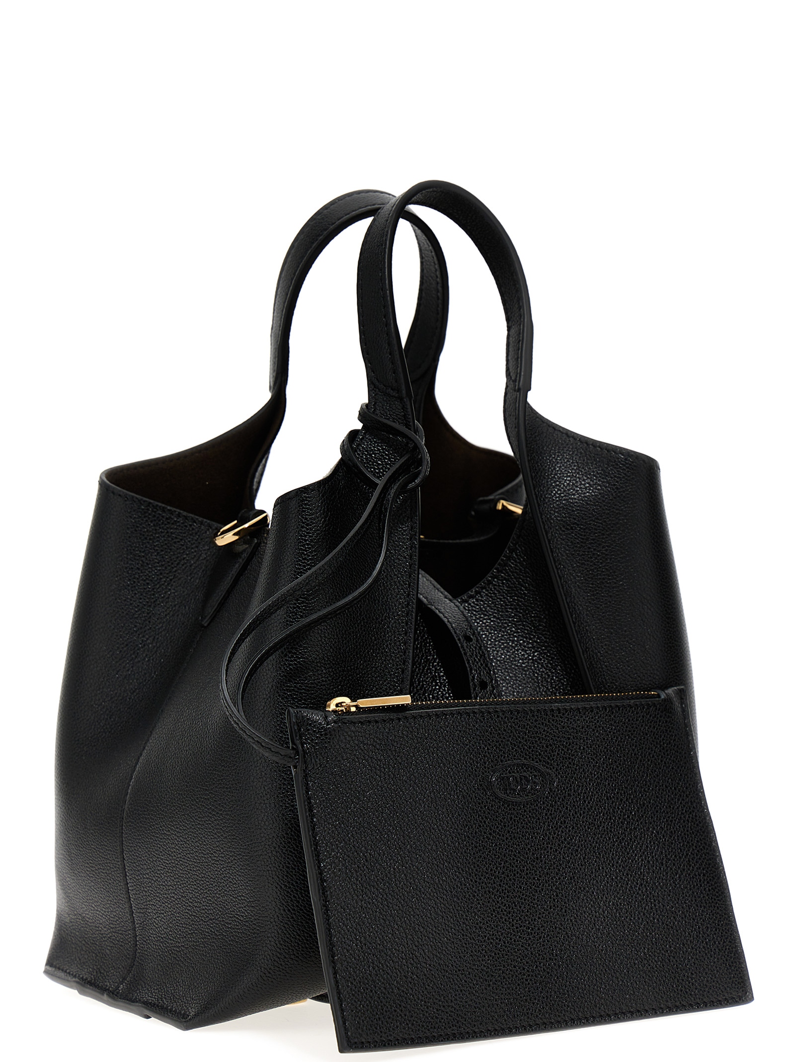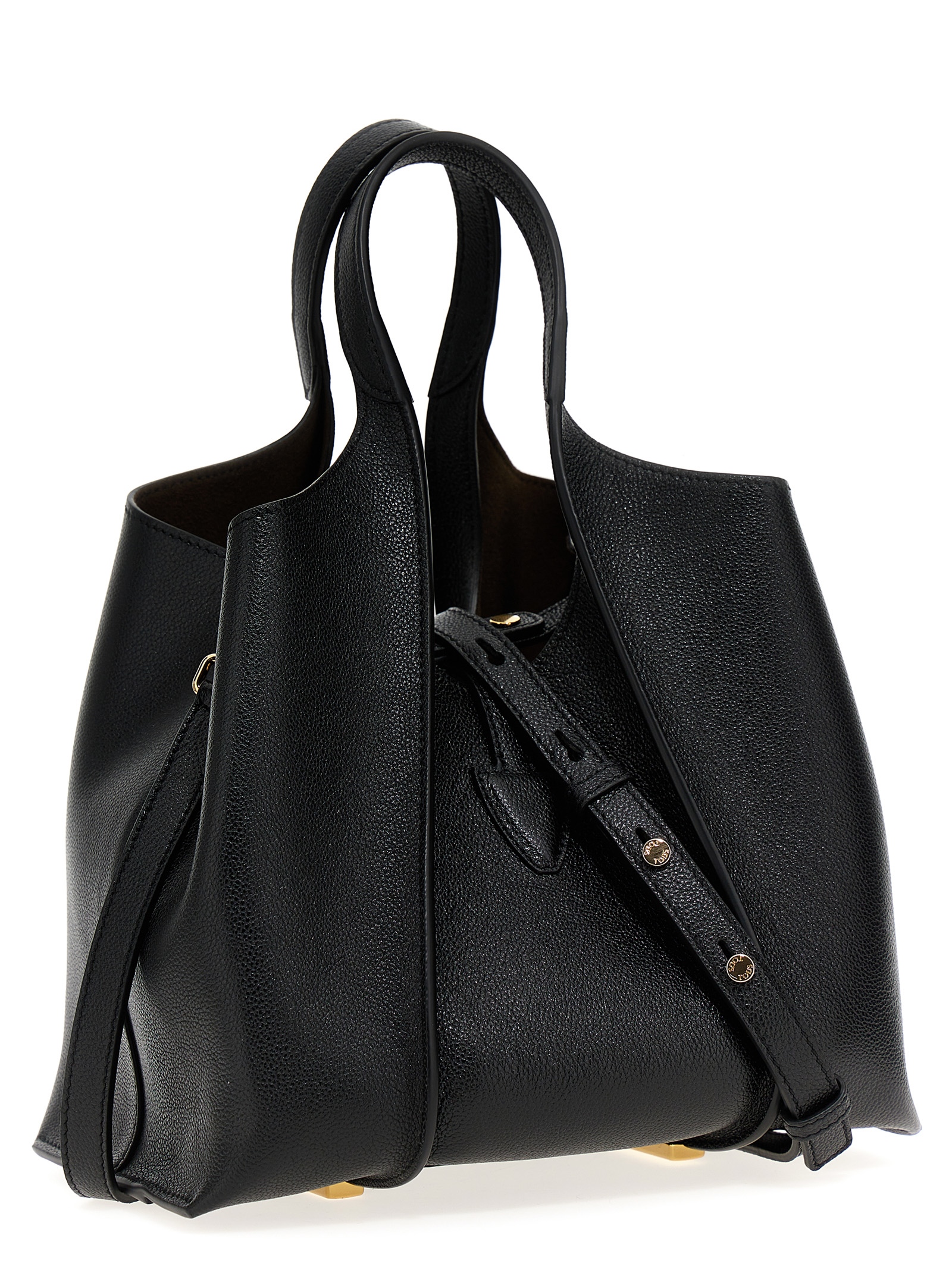 Hammered leather shopping bag with ribbed ribbed and a ‘T Timeless’ metal pendant accessory, double handle, adjustable and removable shoulder strap, a large inner compartment with removable clutch bag and a zip closure.
