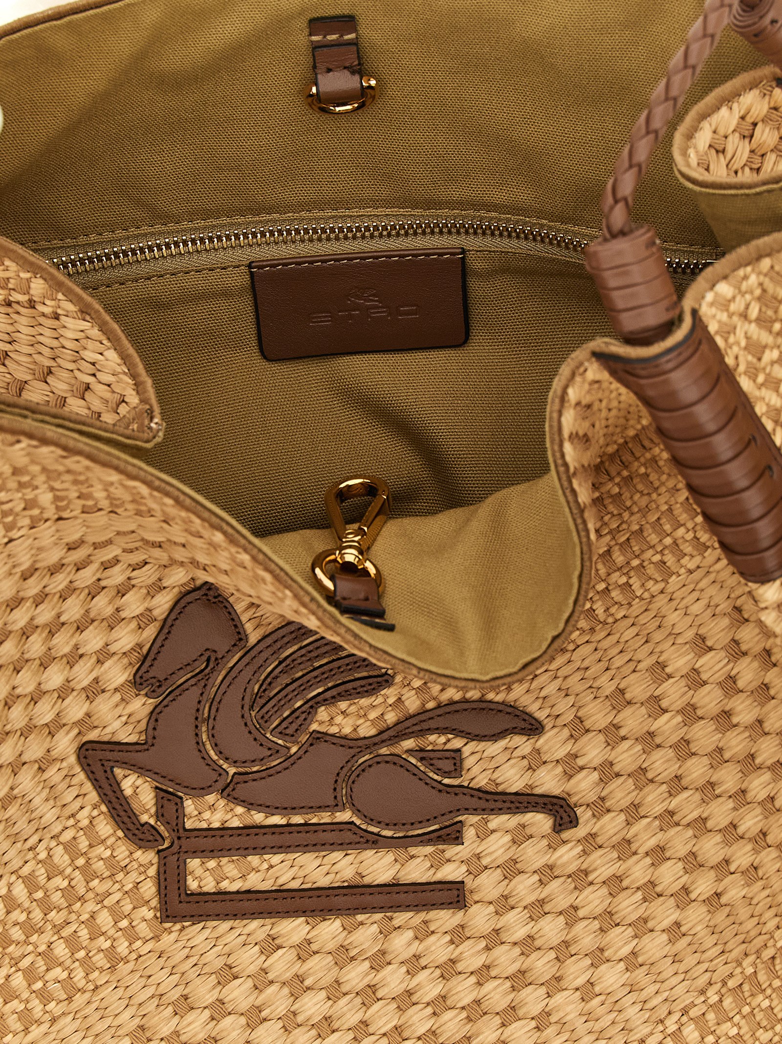 ‘Libra’ in woven raffia with leather details, front ‘Pegaso’ logo patch, threading on the upper corners and two large intertwined handles, one of which is decorated with multicolor marbles, internal carabiner closure, rigid base with metal feet.