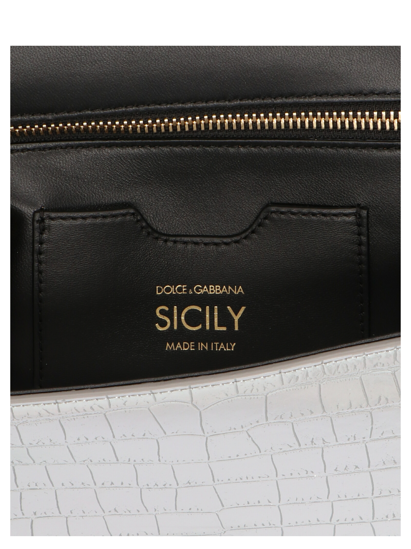 Signature Dolce & Gabbana croc leather handbag with a flap closure and an adjustable shoulder strap embellished with a gold logo tag.