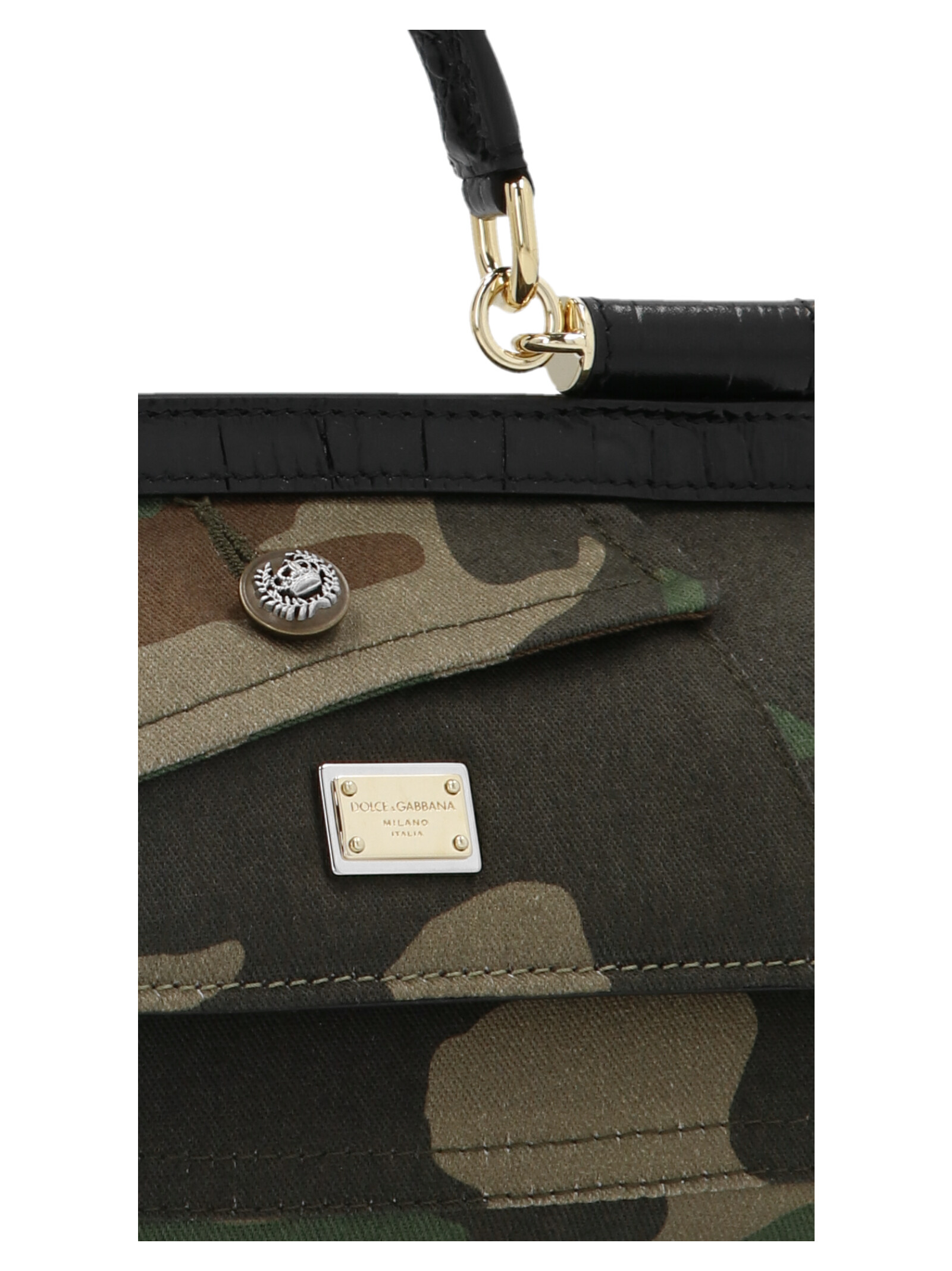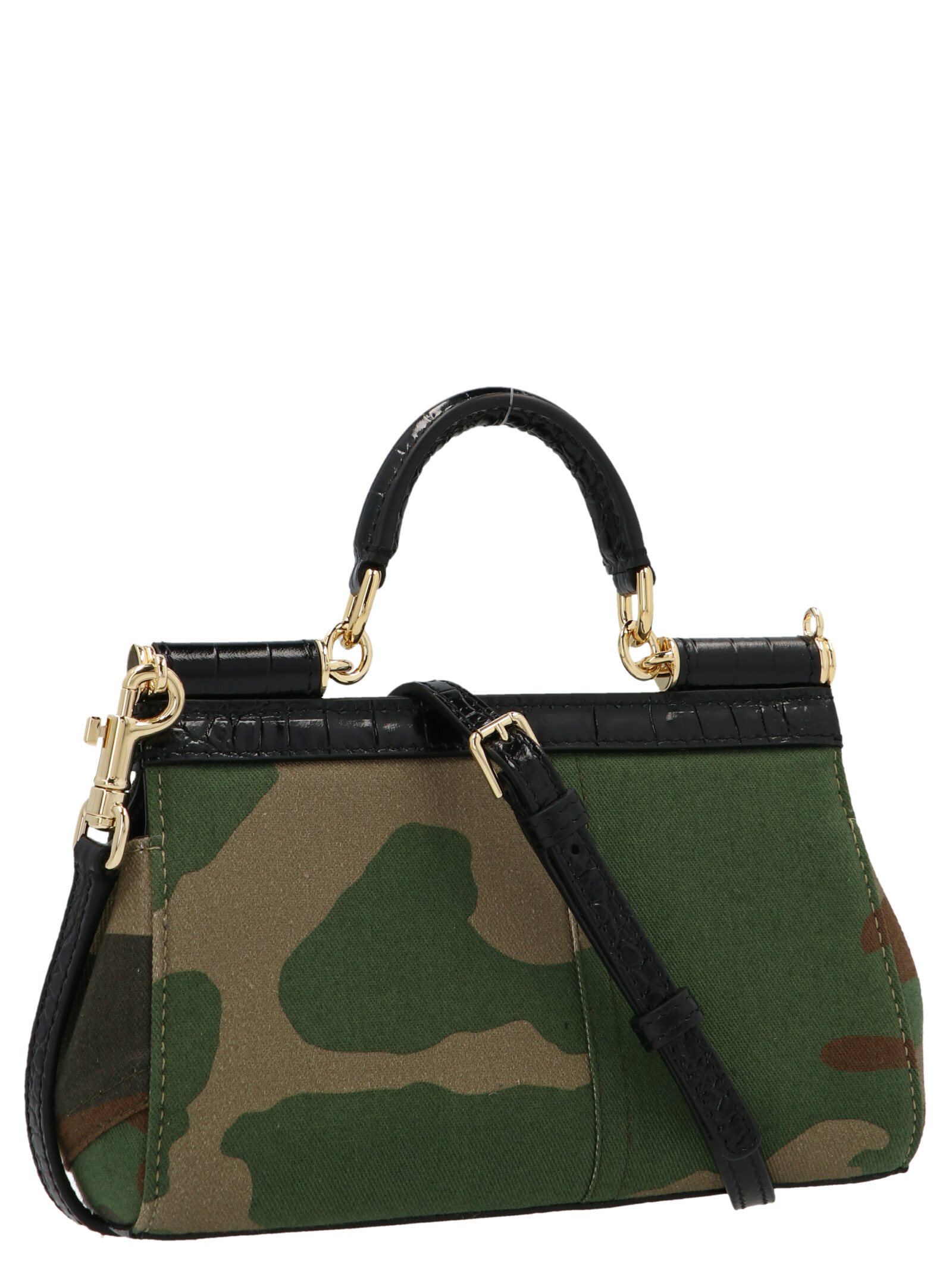 ‘Sicily’ handbag in a patchwork camouflage fabric featuring a top leather handle and a removable shoulder strap.