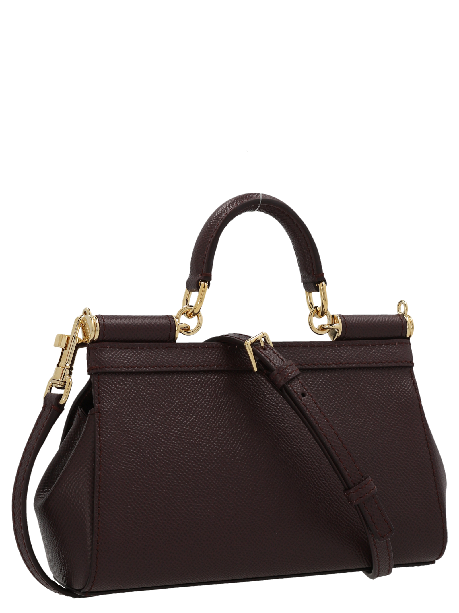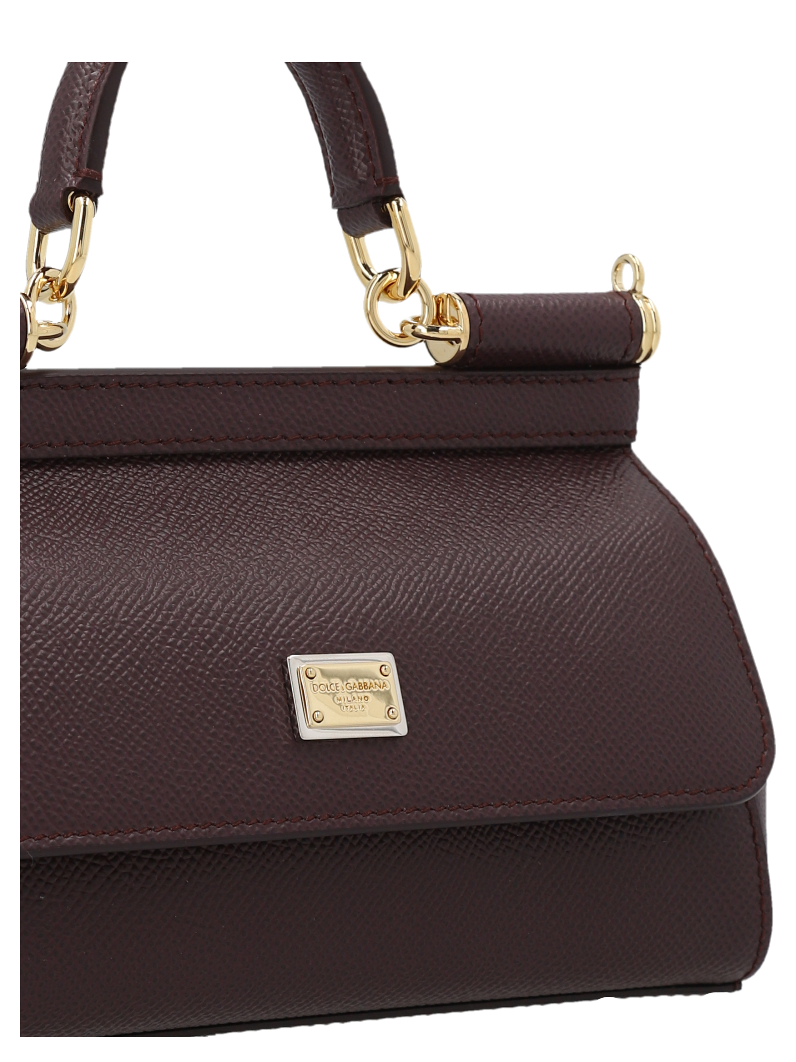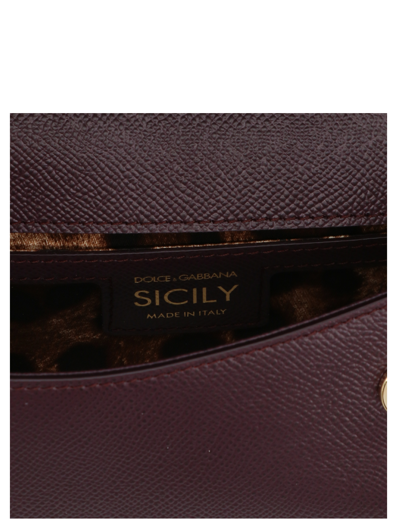‘Sicily’ small handbag in Dauphine leather with magnetic flap closure with metal logo detail, leather handle, adjustable and removable shoulder strap, printed lining and slip pocket.