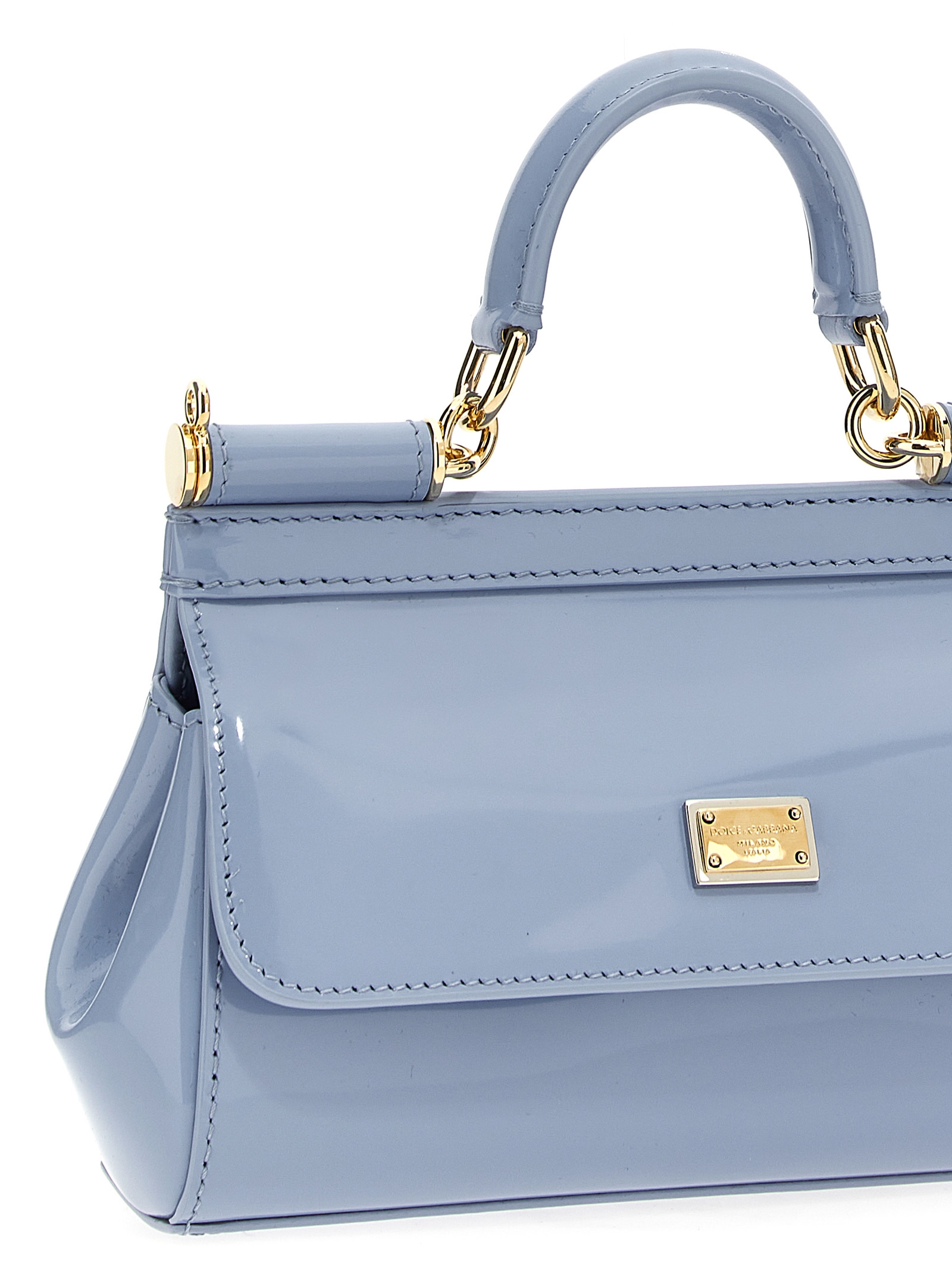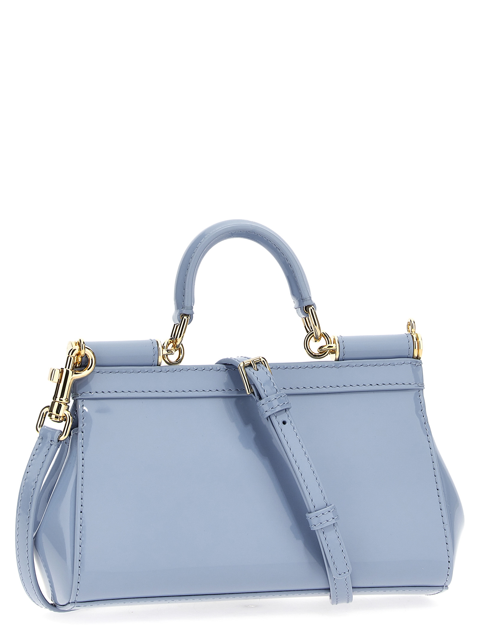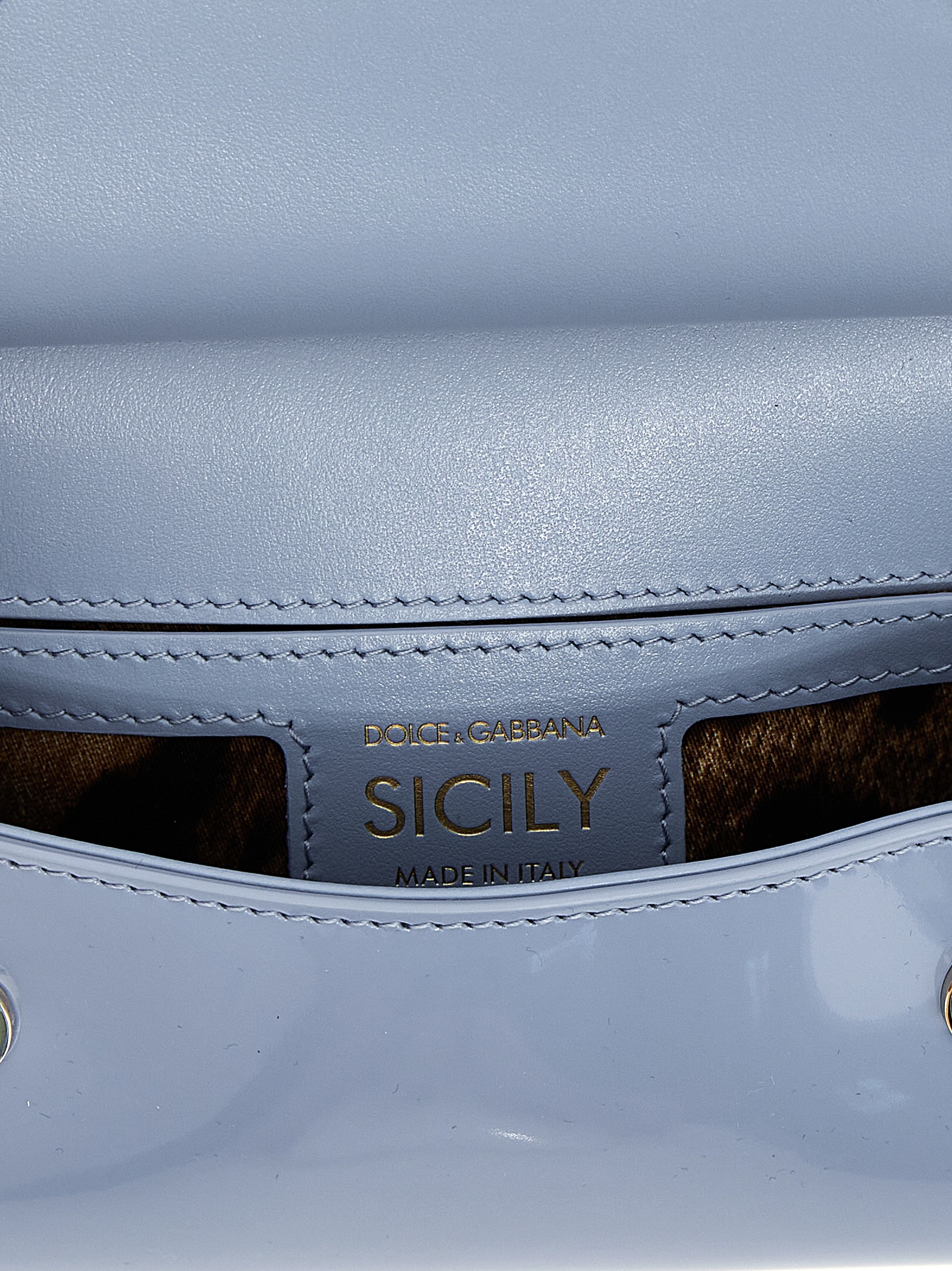 Small ‘Sicily’ shiny leather handbag with front magnetic flap closure, bigalvanic logo tag, fixed top handle, adjustable and removable shoulder strap.