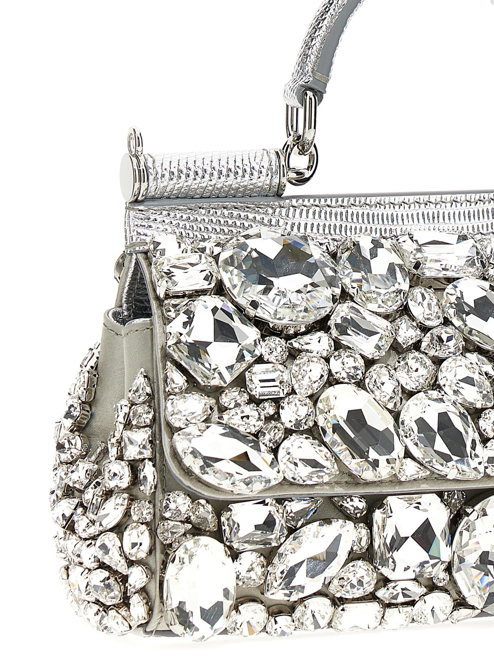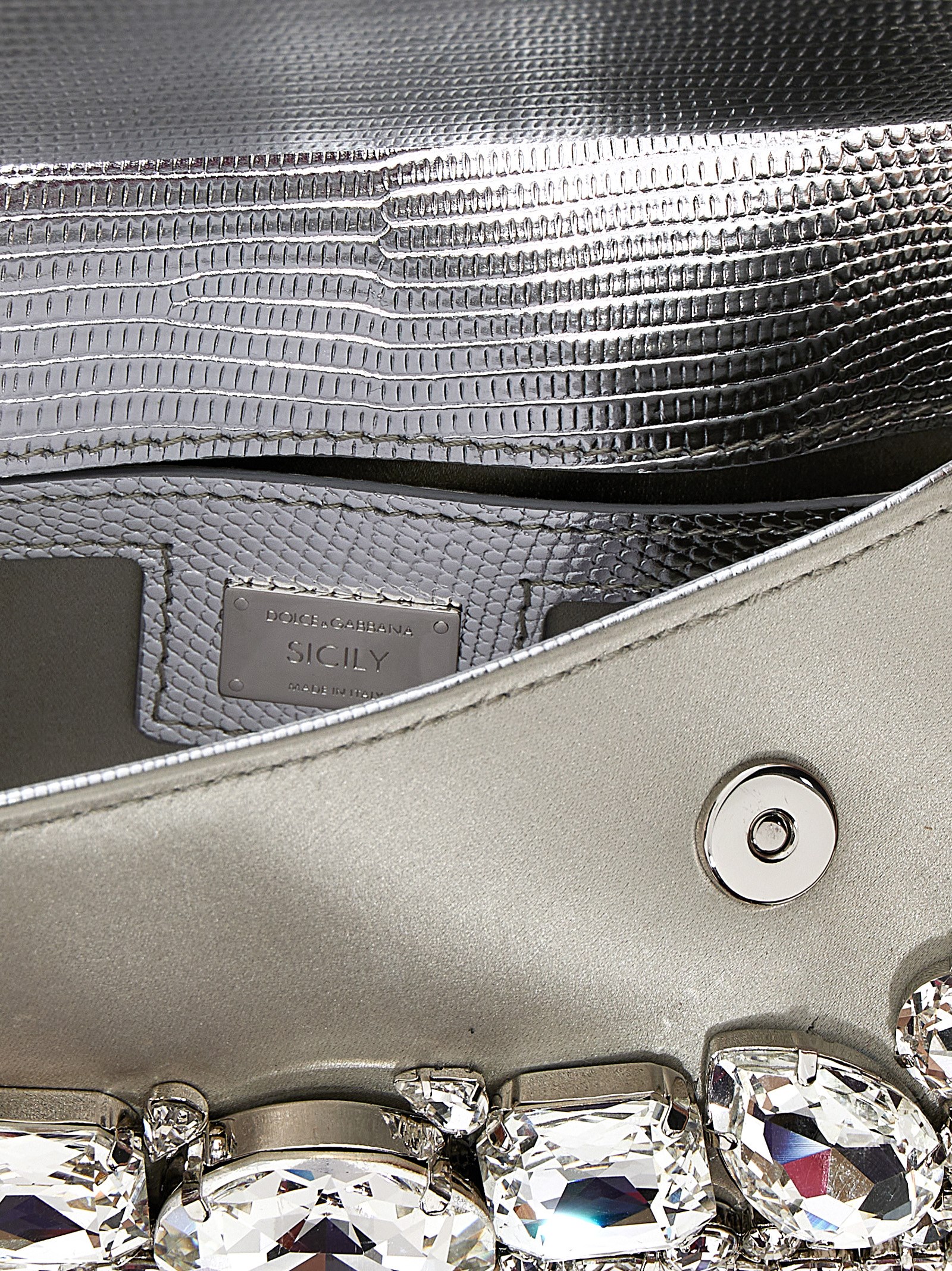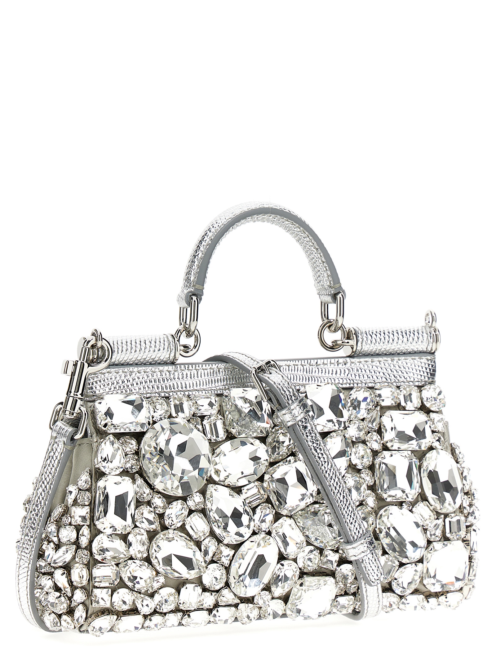 Sicily’ small satin handbag entirely embellished with stones, front magnetic flap closure, top handle and an adjustable and removable shoulder strap in laminated i cashmere print calf leather.