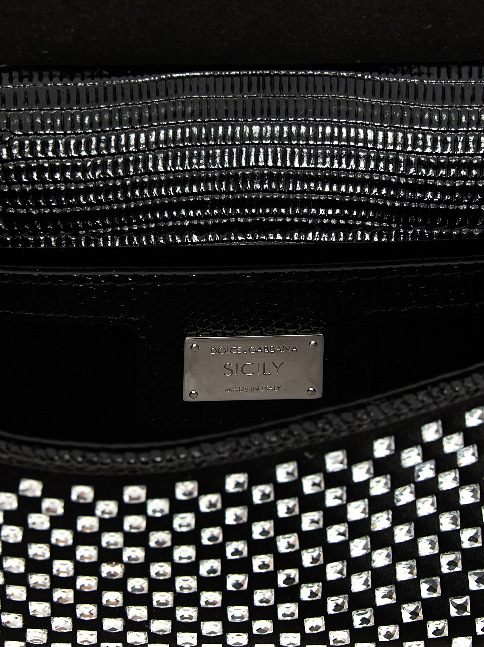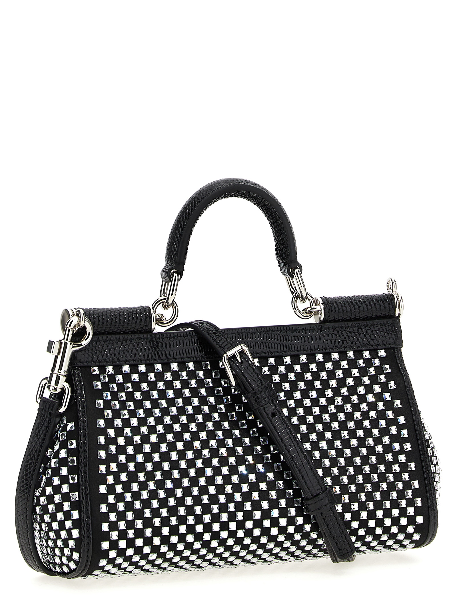 Small ‘Sicily’ satin handbag with leather details, rhinestone appliqué, magnetic flap closure, bigalvanic logo tag, fixed top handle, adjustable and removable shoulder strap.