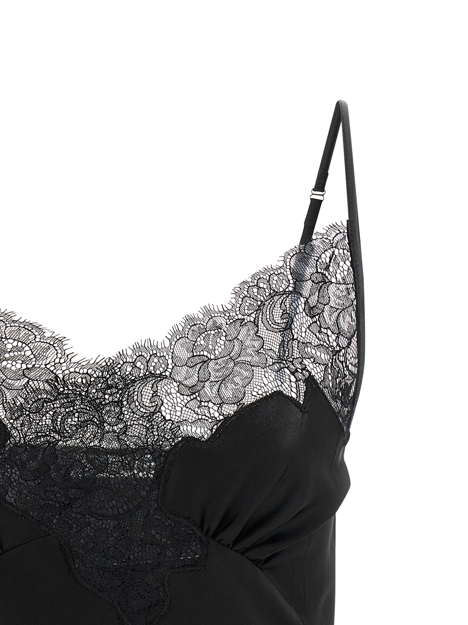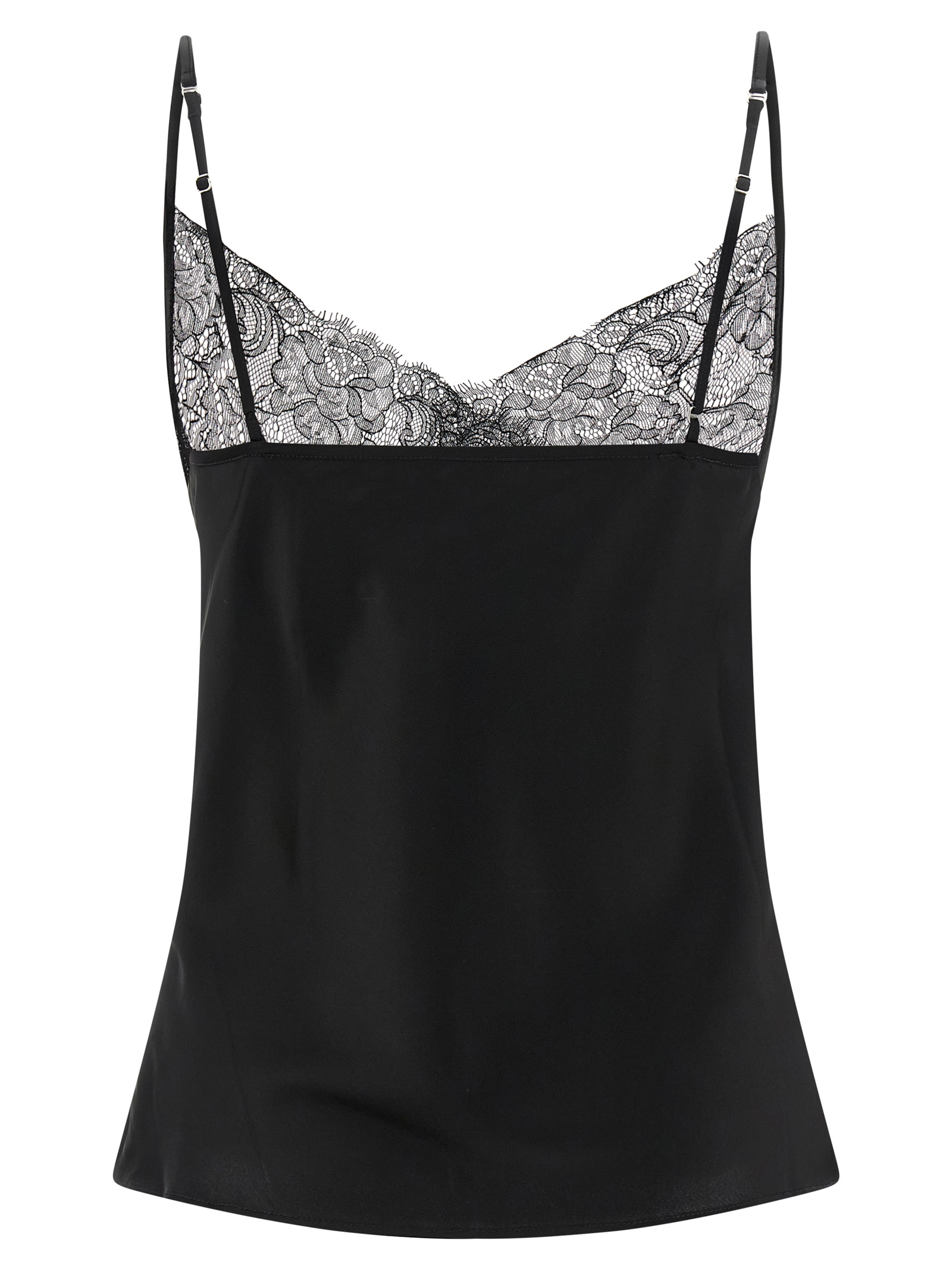 ‘Signature Lace’ slightly stretch vintage-effect satin top, asymmetrical lace inserts on the neckline, ‘lingerie’ inspired model, thin adjustable straps, front curls.